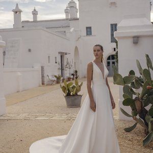 Die lange Schleppe schwingt anmutig bei jedem Schritt und verleiht der Braut einen majestätischen Auftritt. Dieses Kleid vereint klassische Elemente mit modernen Akzenten und ist die perfekte Wahl für die Braut, die an ihrem großen Tag sowohl traditionell als auch zeitgemäß wirken möchte.