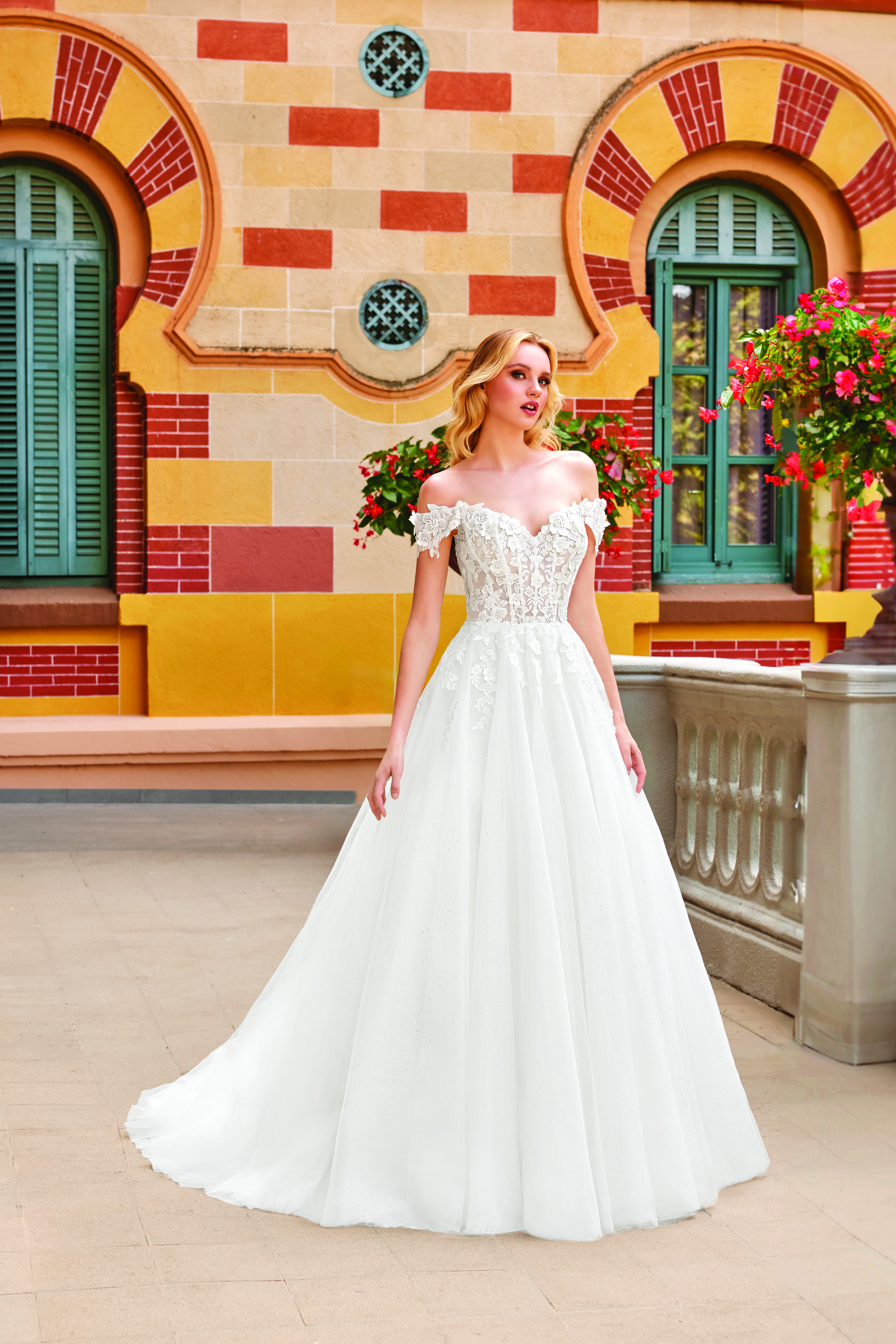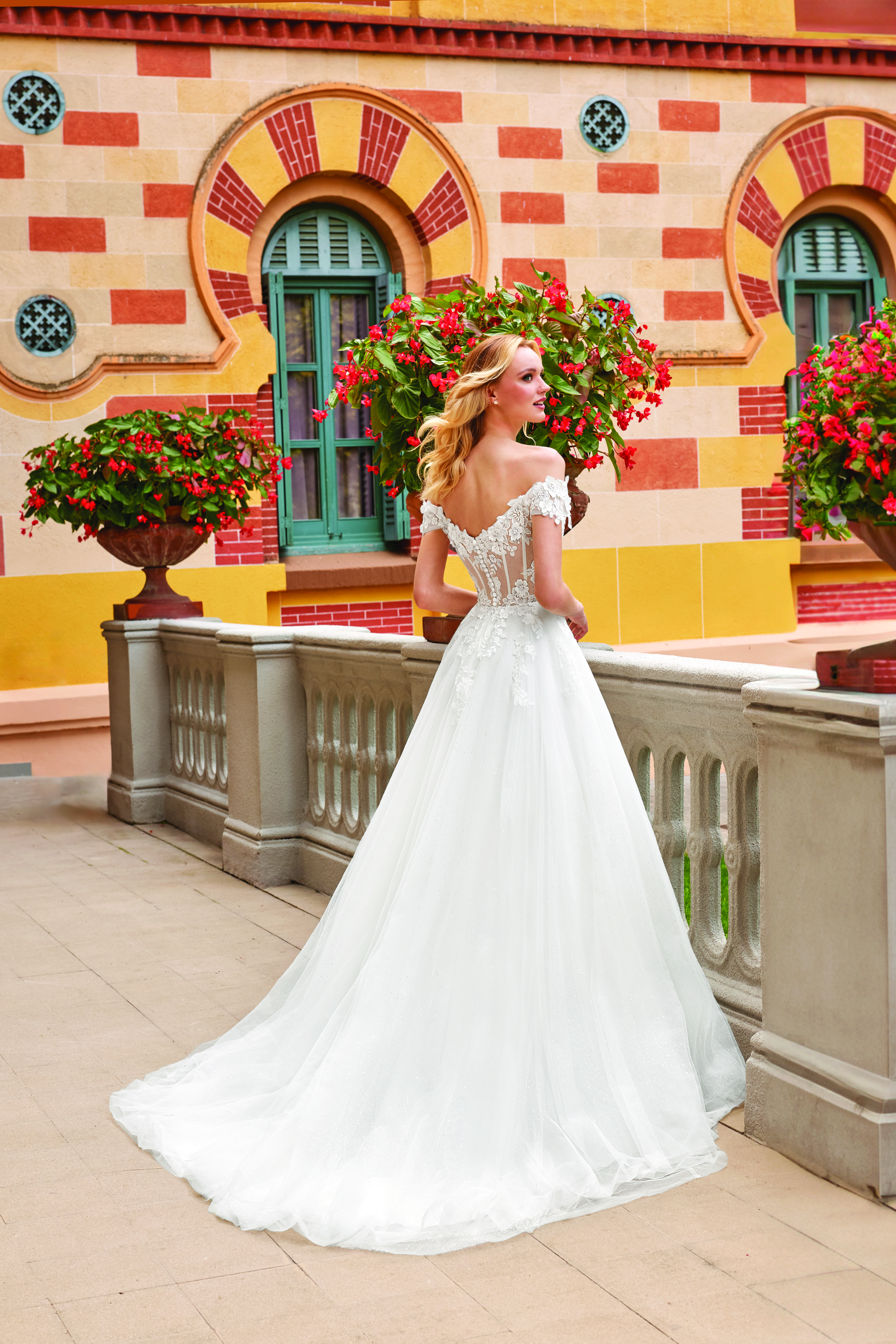 Tauche ein in die Welt der Romantik und Eleganz mit diesem atemberaubenden Prinzessinnen-Brautkleid. Das Kleid besticht durch einen herzförmigen Ausschnitt, der durch die zarten, schulterfreien Ärmel perfekt zur Geltung kommt. Die floralen Spitzenapplikationen auf dem Mieder verleihen dem Kleid eine poetische Leichtigkeit und unterstreichen seine feminine Eleganz. Der transparente Rücken mit zarter Knopfleiste gibt dem Kleid einen modernen Touch, während der voluminöse Tüllrock mit feinen Stickereien für einen Hauch von Dramatik sorgt.