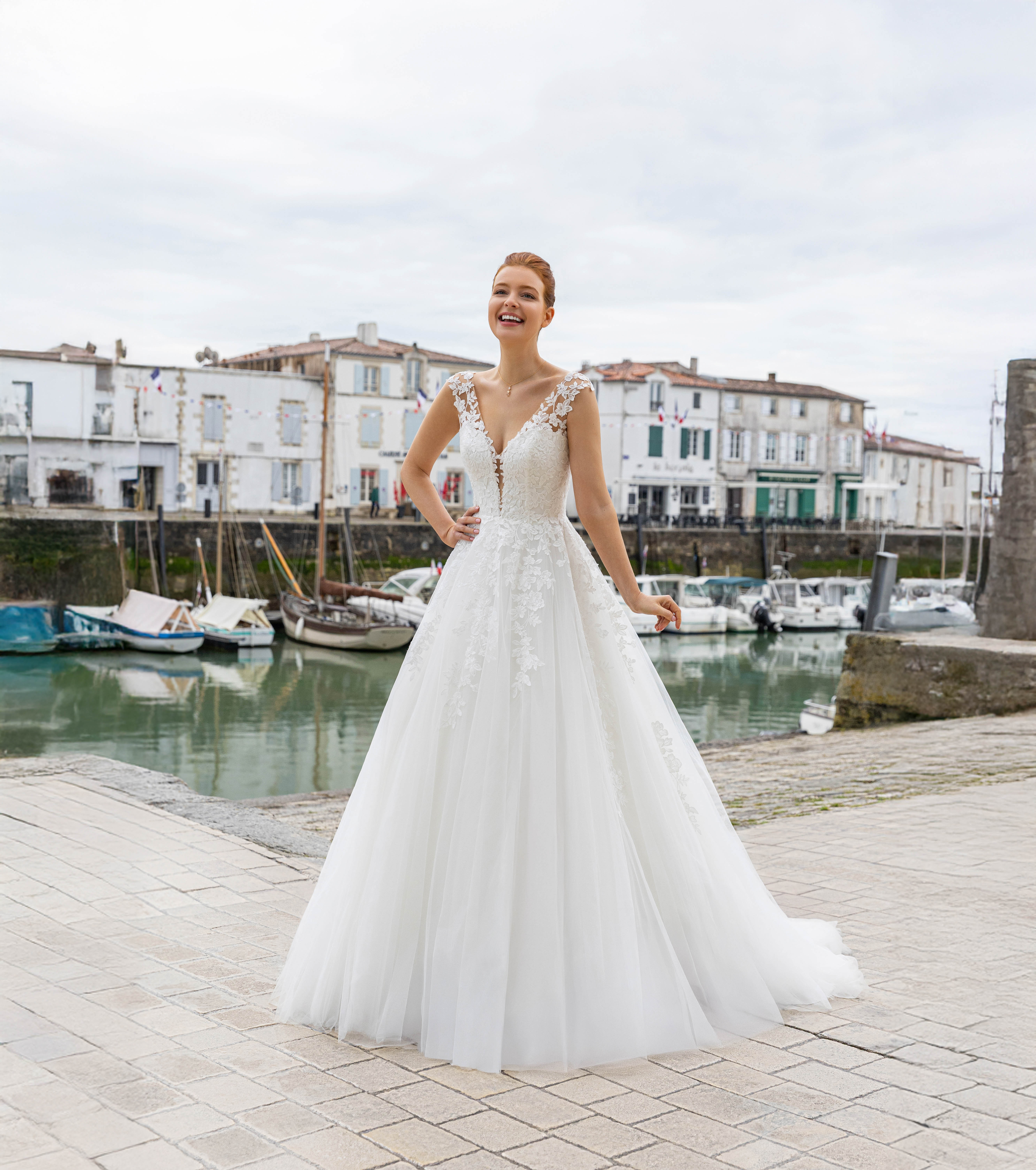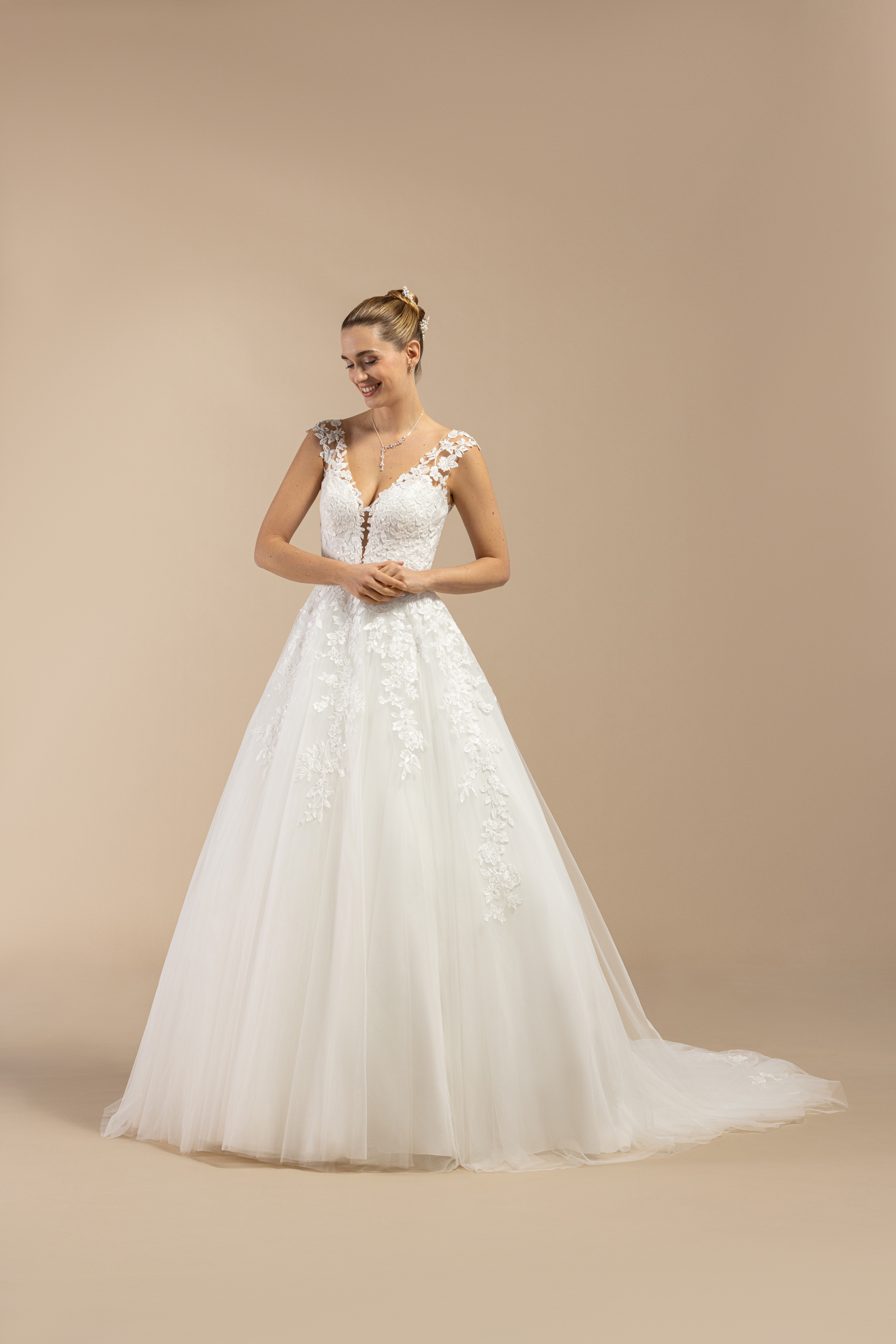 Romantik trifft auf moderne Eleganz: Dieses Prinzessinnen-Brautkleid macht Deinen großen Tag unvergesslich. Der ausgestellte Rock aus feinem Tüll sorgt für Volumen und Leichtigkeit zugleich – ideal, wenn Du Dir ein Brautkleid wünschst, das sowohl glamourös als auch bequem ist.