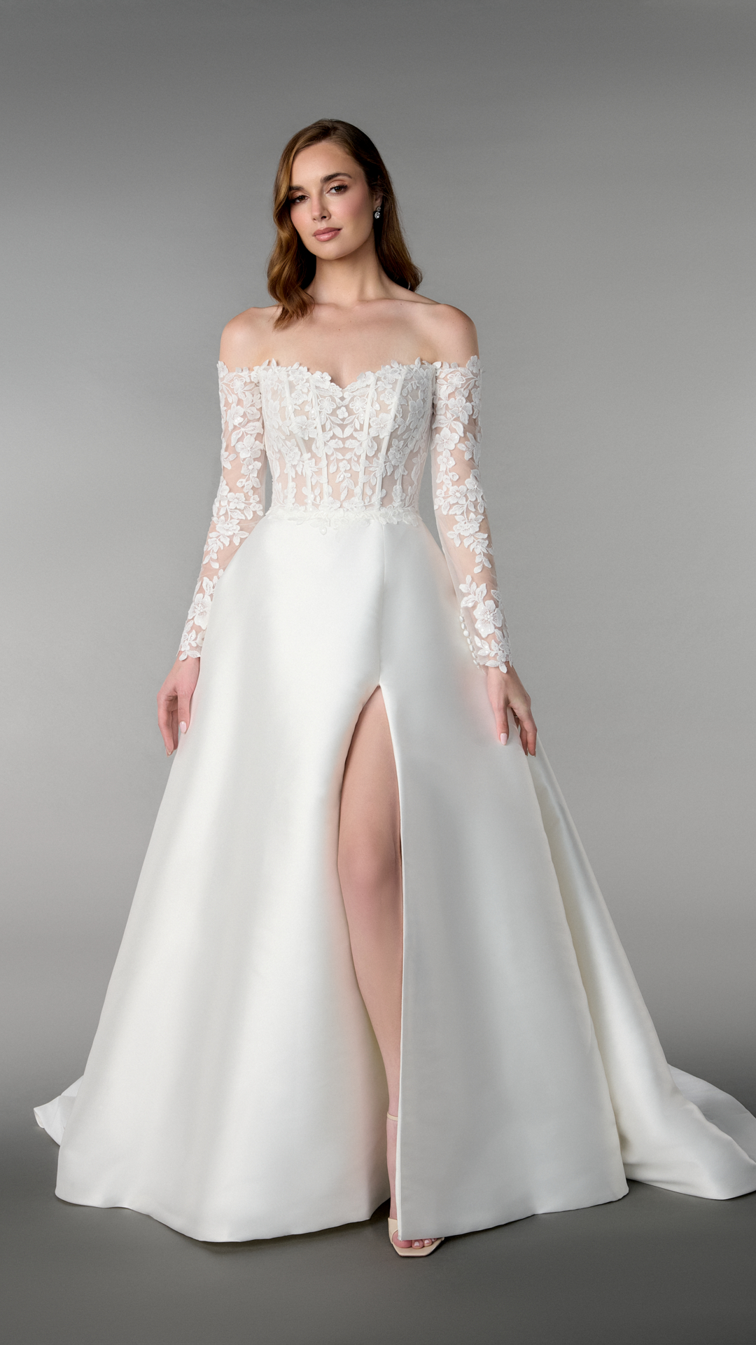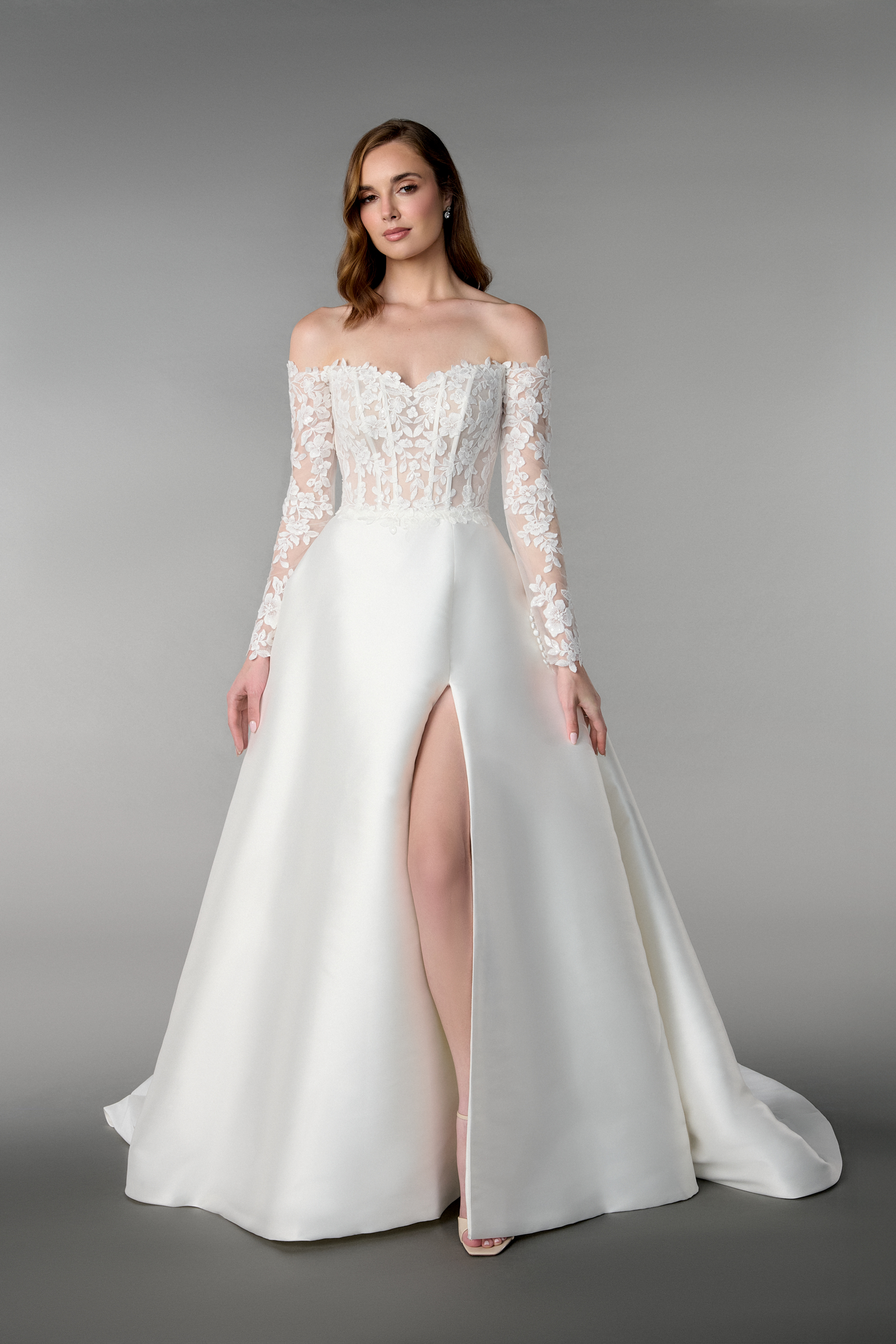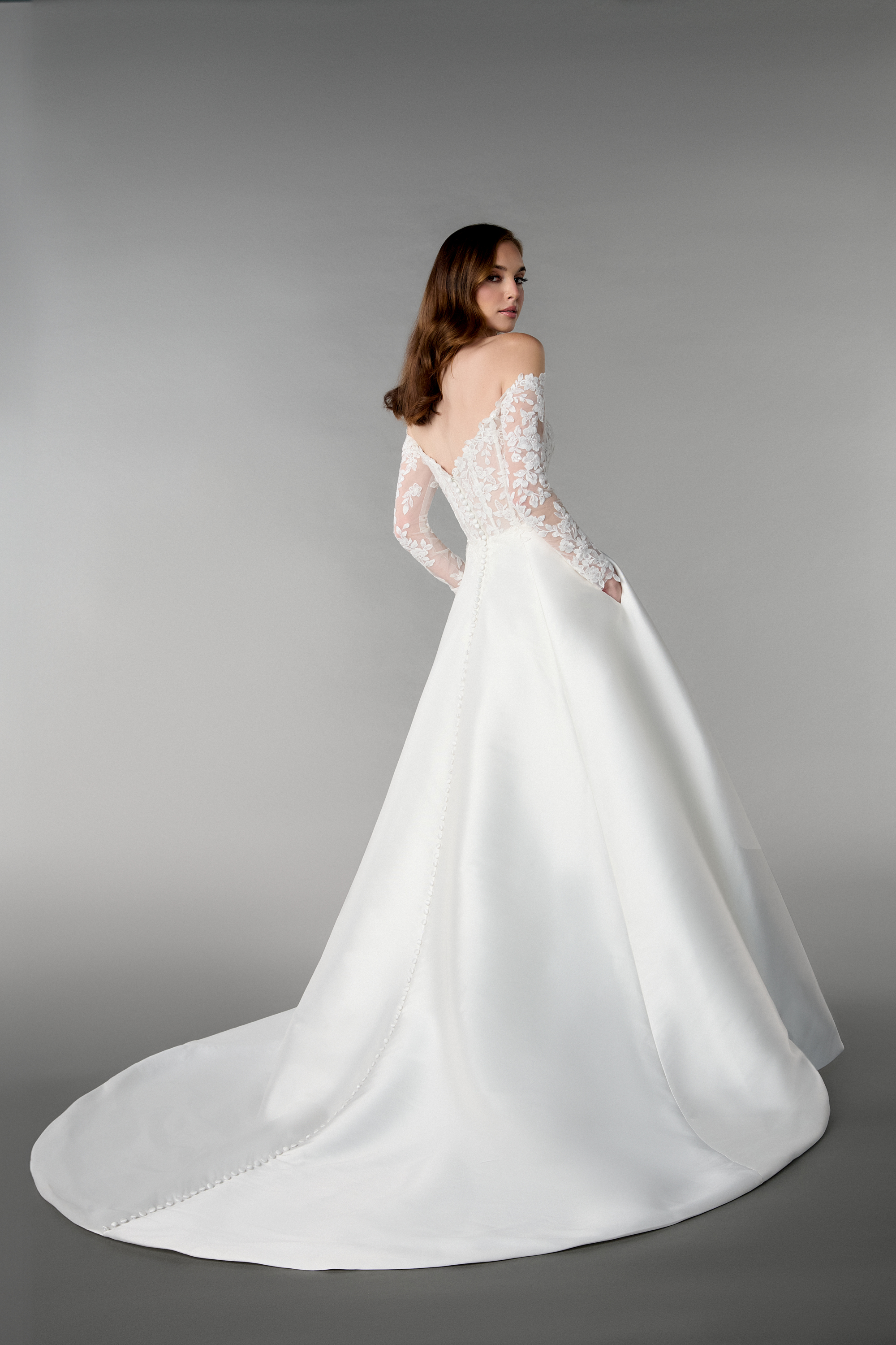 Ob Du dieses Brautkleid mit den langen, transparenten Ärmeln im Off-Shoulder-Stil oder ganz trägerlos trägst – Du entscheidest, wie Du Deinen großen Tag feiern willst. Die feinen Knöpfe entlang der Rückenpartie setzen einen eleganten Akzent und runden den Look stilvoll ab. Dieses elegante Prinzessinnen-Brautkleid ist perfekt für Bräute, die ein Statement setzen wollen – feminin, selbstbewusst und detailverliebt.