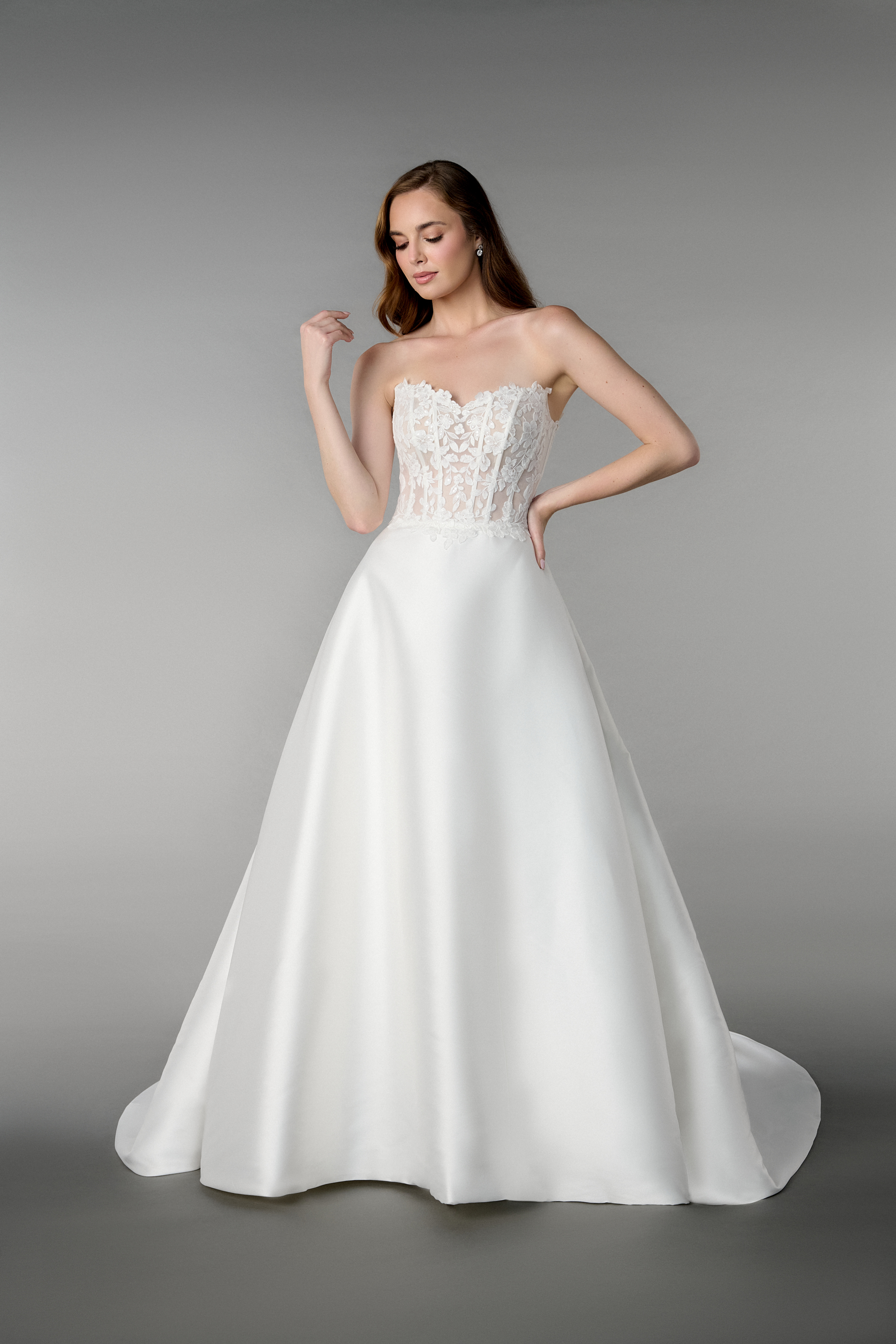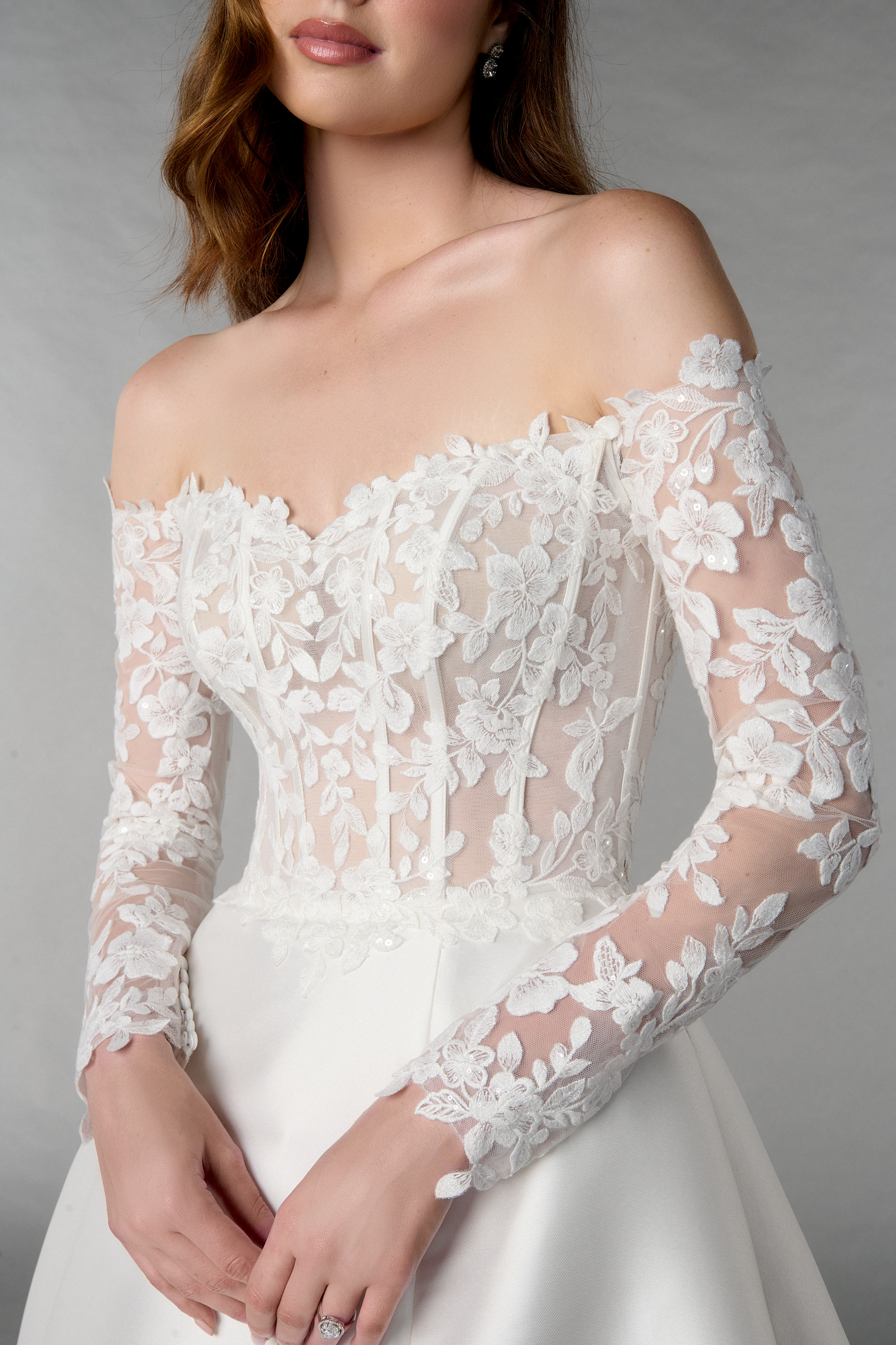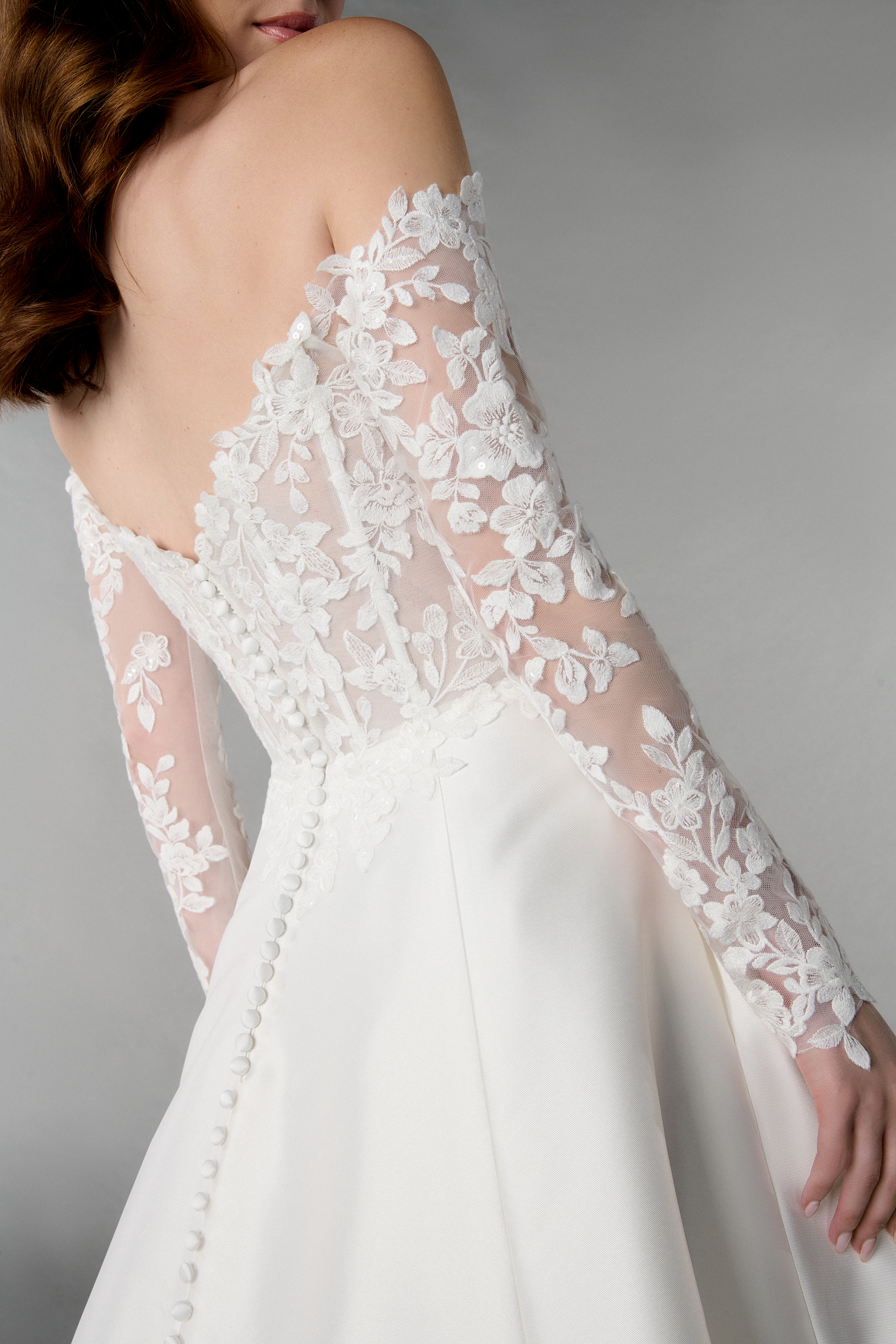 Ob Du dieses Brautkleid mit den langen, transparenten Ärmeln im Off-Shoulder-Stil oder ganz trägerlos trägst – Du entscheidest, wie Du Deinen großen Tag feiern willst. Die feinen Knöpfe entlang der Rückenpartie setzen einen eleganten Akzent und runden den Look stilvoll ab. Dieses elegante Prinzessinnen-Brautkleid ist perfekt für Bräute, die ein Statement setzen wollen – feminin, selbstbewusst und detailverliebt.