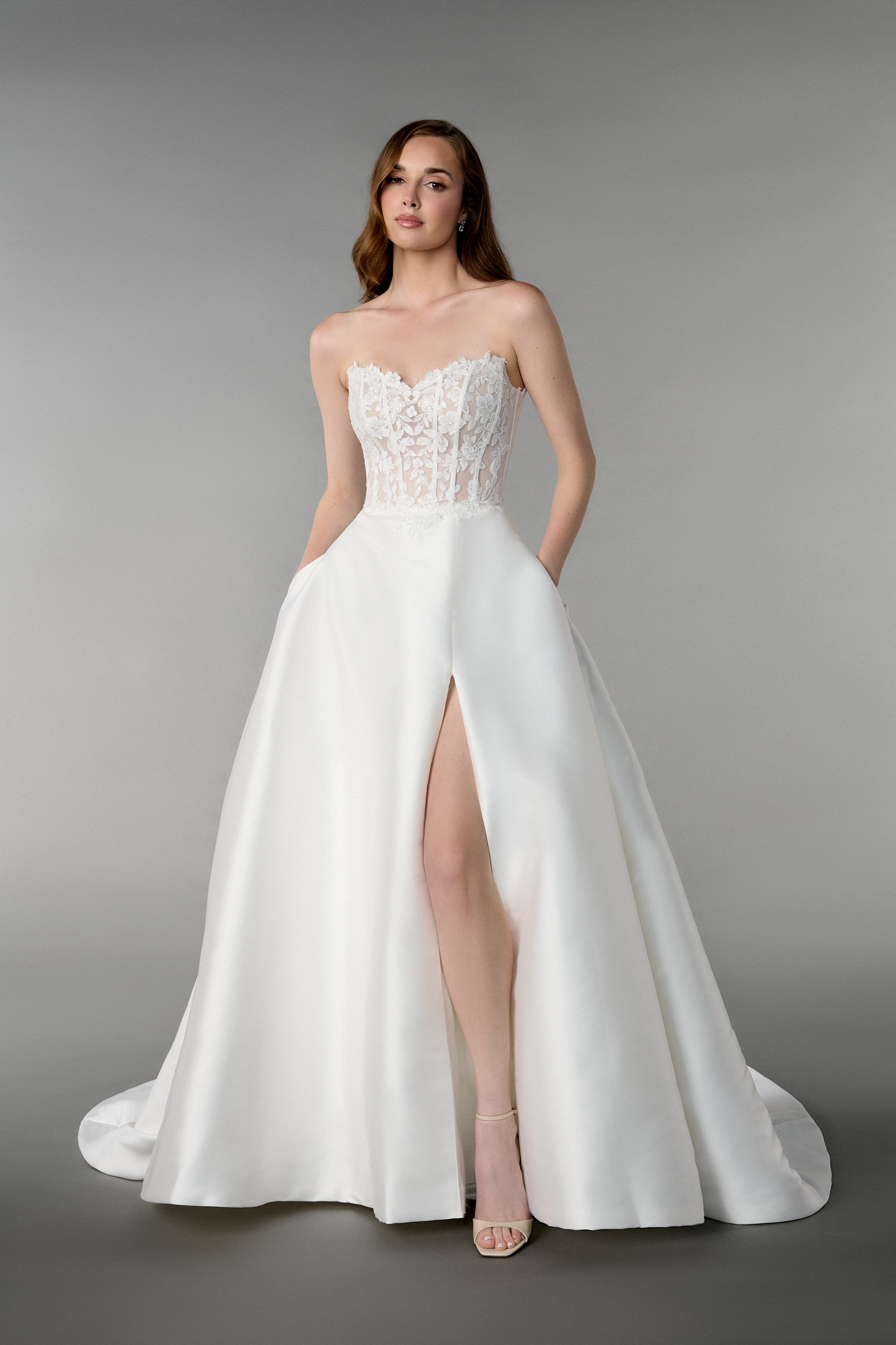 Du träumst von einem Brautkleid, das königlich aussieht und gleichzeitig super modern ist? Dieses Prinzessinnen-Brautkleid vereint beides! Der glatte Satinrock mit edlem Beinschlitz sorgt für einen glamourösen Auftritt – mit extra viel Bewegungsfreiheit. Das Spitzenoberteil mit Herzausschnitt und floralen Details schmeichelt Deinem Dekolleté und zaubert eine traumhafte Silhouette.