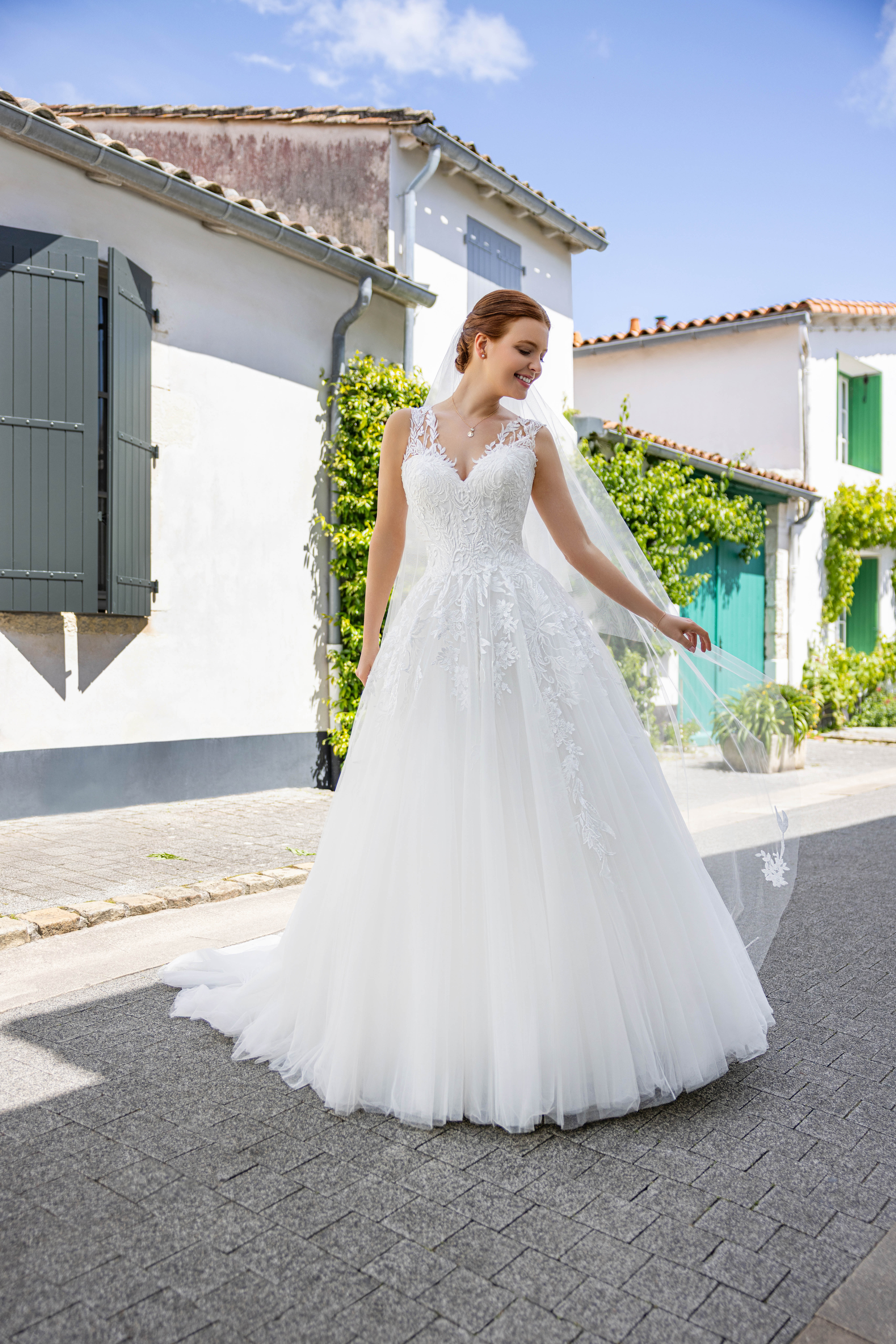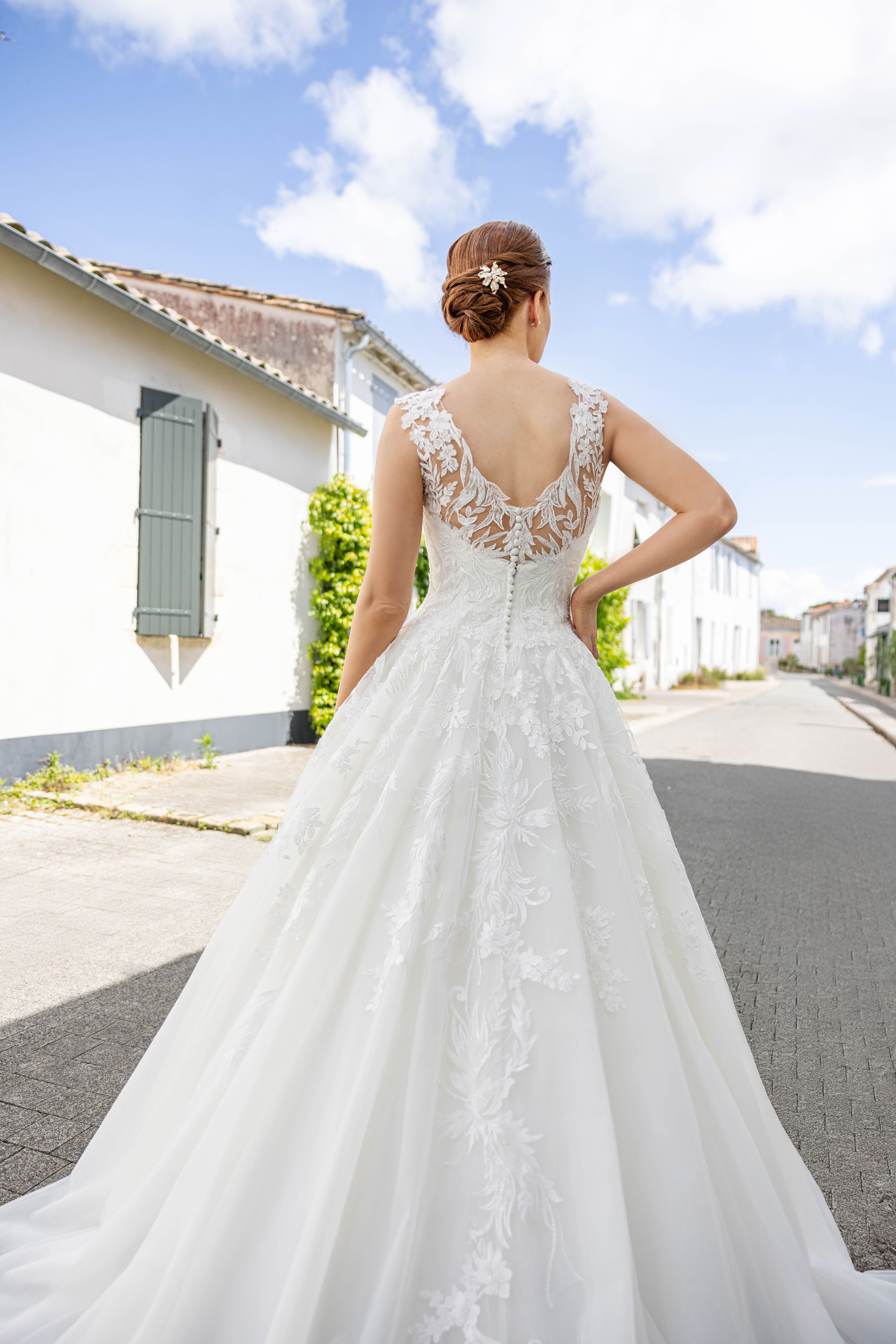Hinten geht’s direkt spannend weiter: die transparente Rückenpartie bringt Leichtigkeit in deinen Bridal-Look und zeigt, dass ein Prinzessinnen-Brautkleid absolut fresh aussehen kann. Dazu die feinen Spitzen-Details, die im Licht subtil funkeln – perfekt für Deinen großen Auftritt, ohne überladen zu wirken.