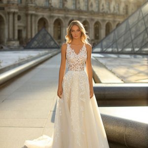 Ein ideales Modell für Bräute, die eine Mischung aus klassischer Eleganz und moderner Raffinesse schätzen. Dieses Kleid verspricht einen einzigartigen Auftritt und bleibt garantiert unvergessen.