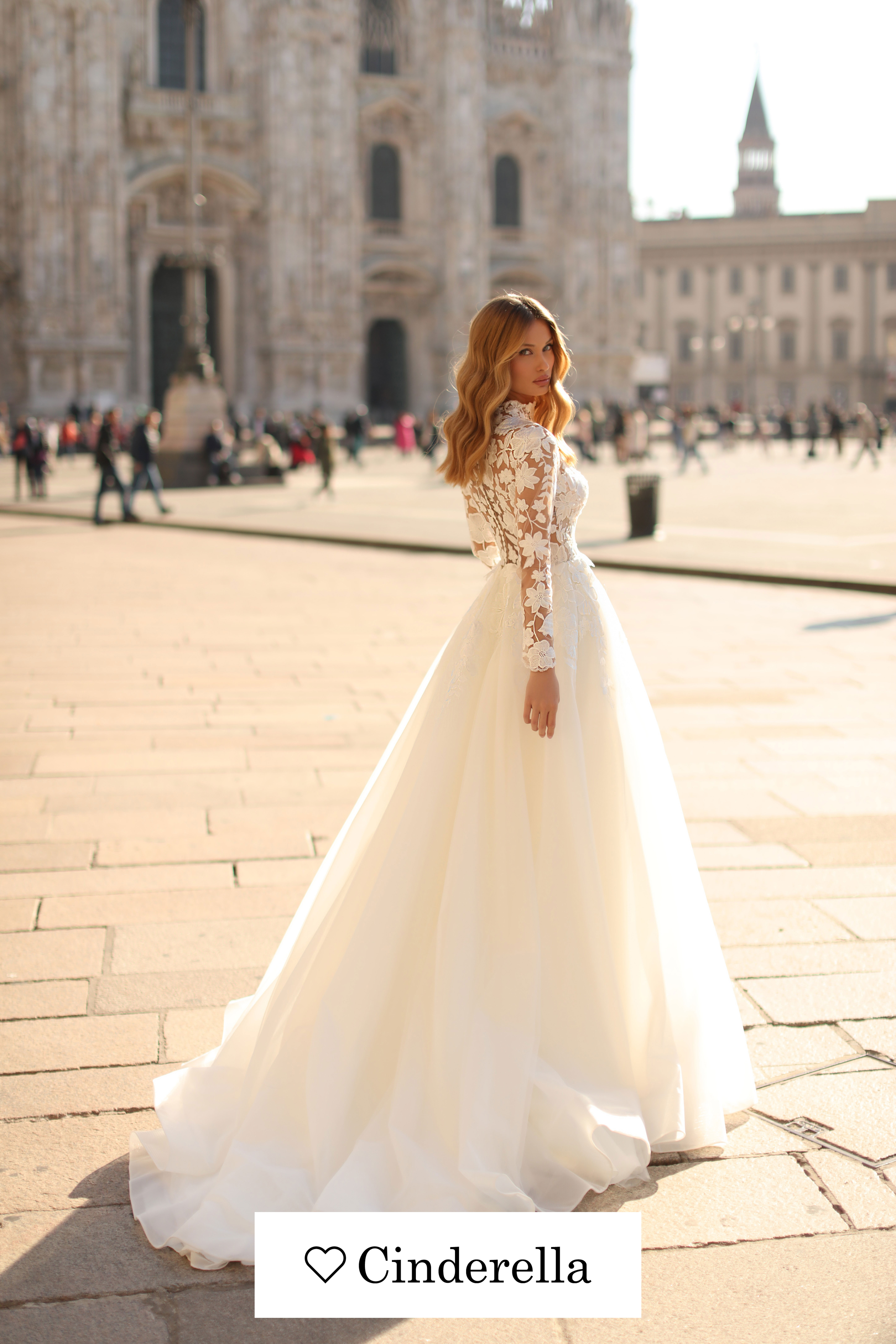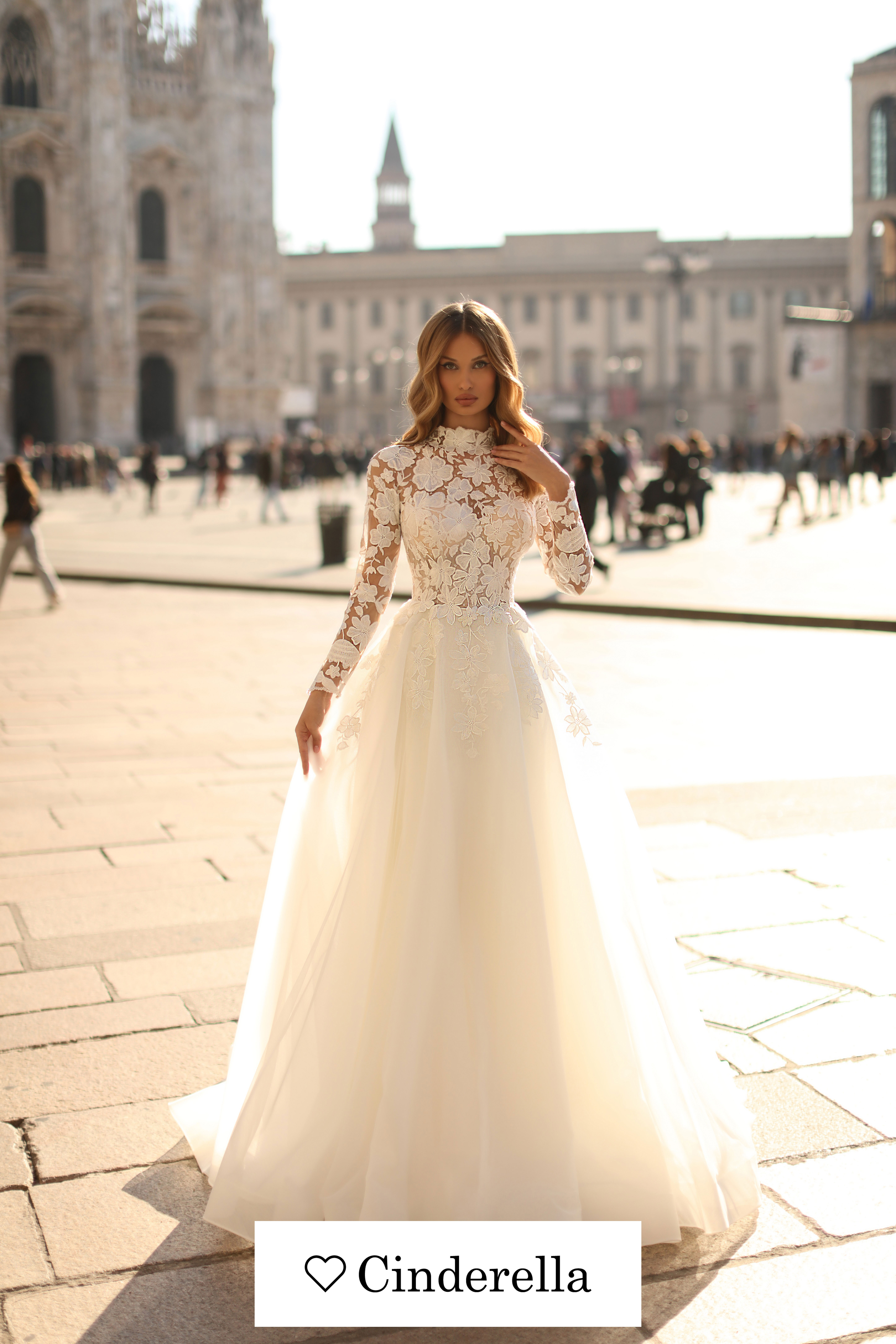 Das Brautkleid "Rom" aus der 2025 Kollektion von Cinderella vereint klassischen Chic mit einer modernen Note. Das Oberteil aus durchscheinender floraler Spitze verleiht dem Kleid eine romantische und zugleich raffinierte Optik. Die hohen, langen Ärmel mit Spitze bieten eine elegante Alternative zu ärmellosen Designs und setzen stilvolle Akzente.