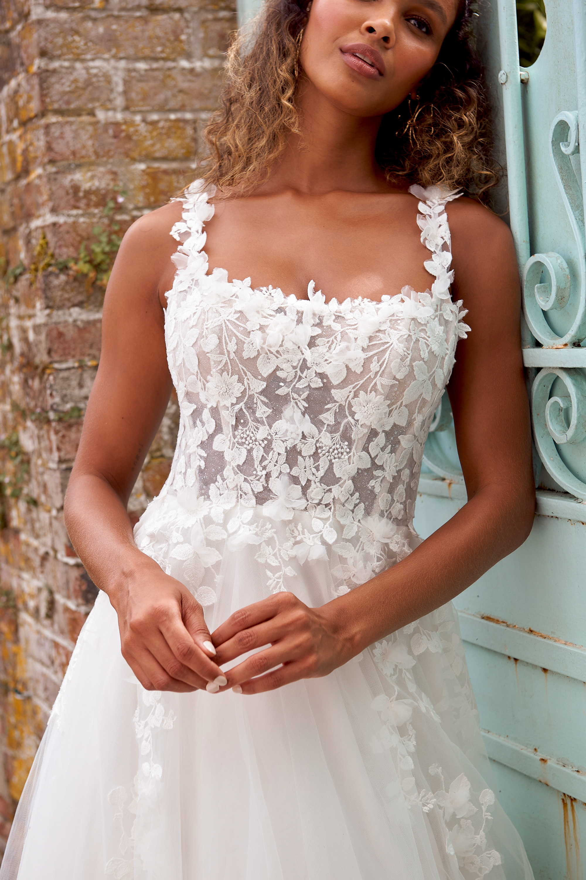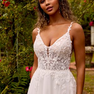 Dieses A-Linien Brautkleid setzt auf Leichtigkeit und eine moderne, feminine Linie. Das semi-transparente Korsagen-Oberteil zeigt feine Stäbchen und aufgesetzte, florale Spitze, die sich sanft in den Rock aus mehrlagigem Softtüll fortsetzt. Die zarten, spitzenbesetzten Träger und der gerade, weich geformte Ausschnitt betonen Schultern und Dekolleté ohne tiefen V-Schnitt – elegant, clean und absolut zeitgemäß. Der Rücken ist schmeichelnd ausgeschnitten, eine feine Knopfleiste rundet den Look ab.