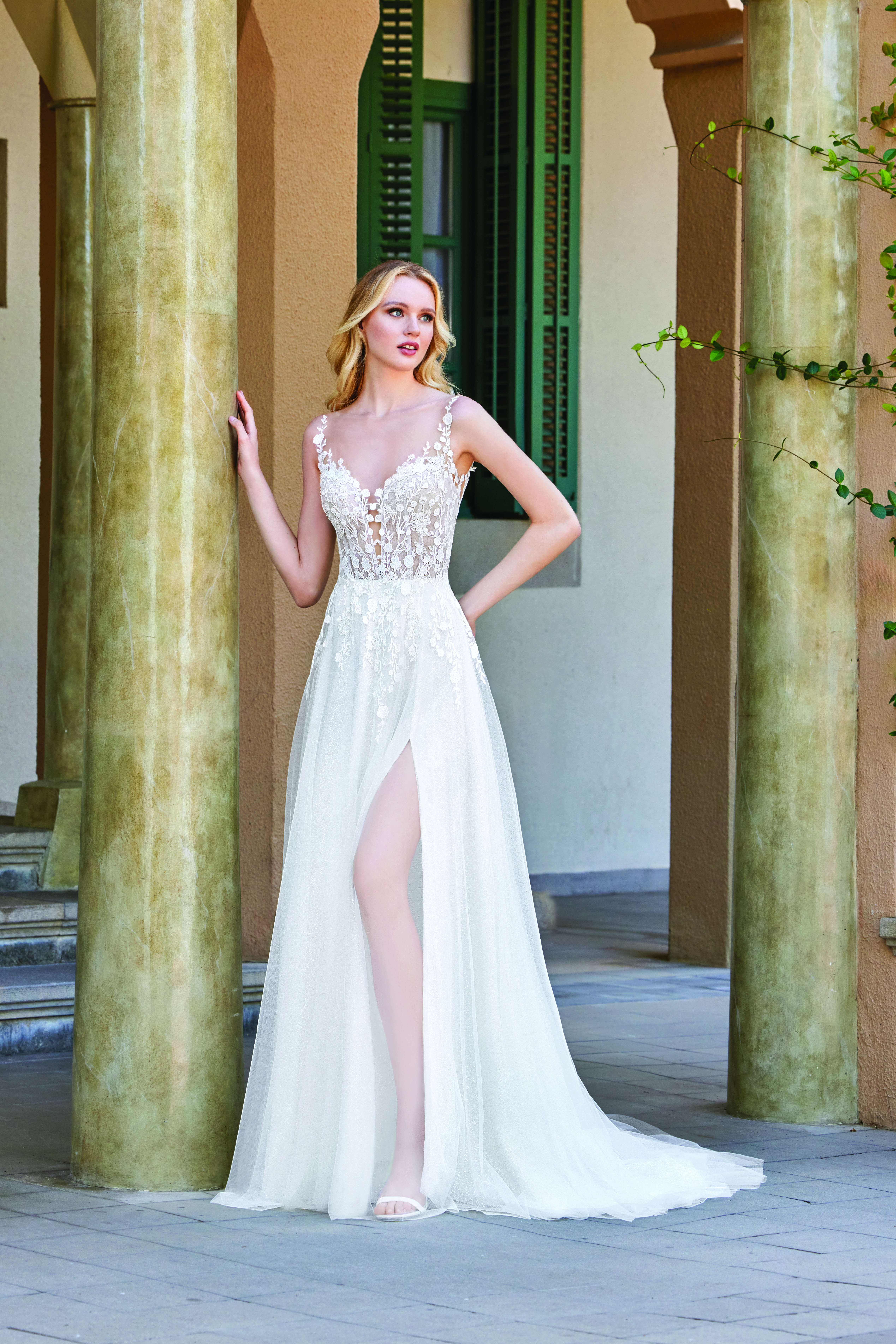 Dieses Kleid ist perfekt für die Braut, die sich an ihrem großen Tag sowohl romantisch als auch modern präsentieren möchte. Der Mix aus traditioneller Spitze, einem verführerischen Schnitt und modernen Details macht dieses Kleid zu einem unvergesslichen Highlight.
