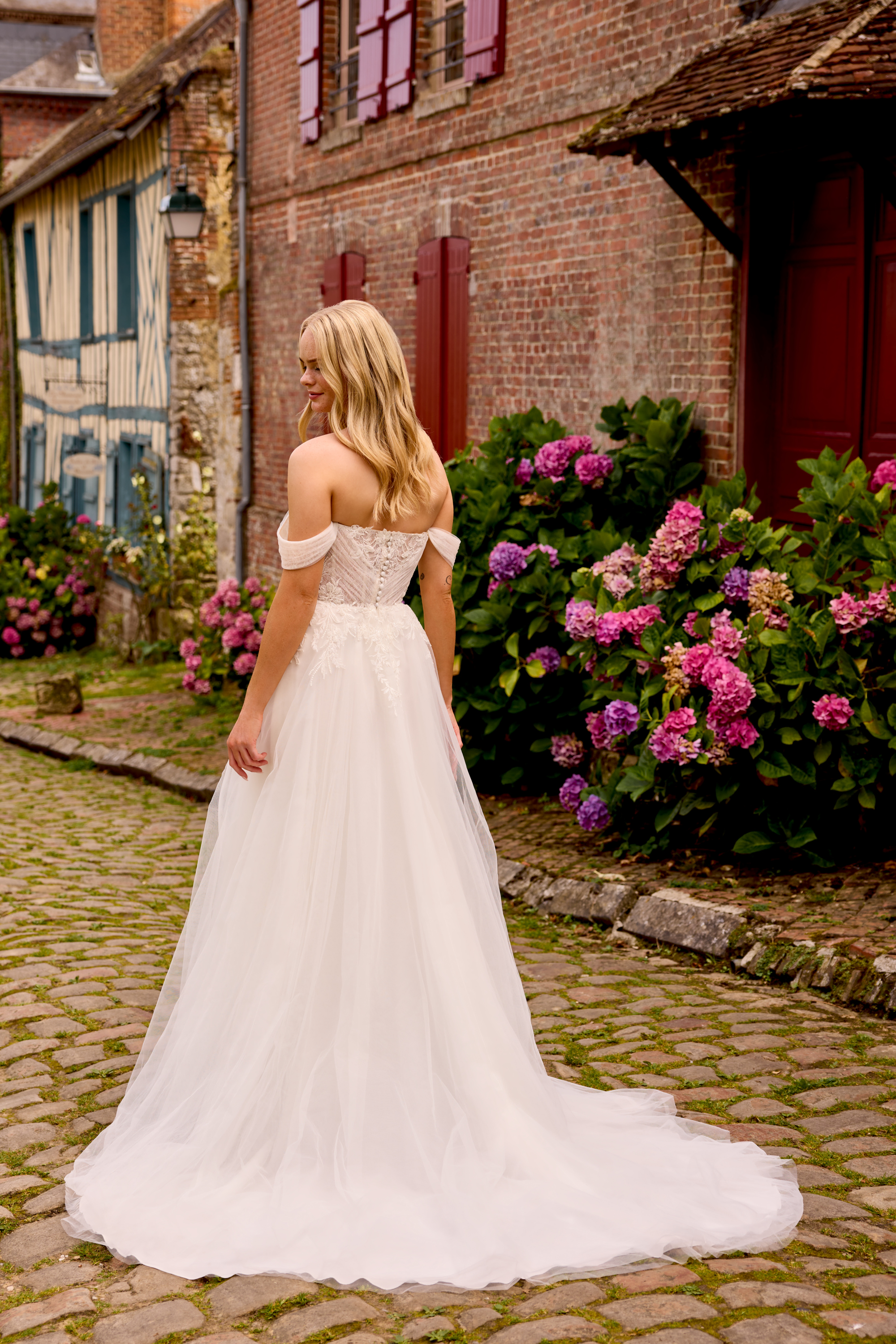 Dieses A-Linien Brautkleid strahlt feminine Leichtigkeit und eine verspielte, romantische Note aus. Die angesagten Carmen-Träger betonen deine Schultern und dein Dekolleté auf besonders schmeichelhafte Weise. Raffinierte Drapierungen aus feinem Tüll formen das Oberteil und verleihen dem Design eine weiche, elegante Struktur.