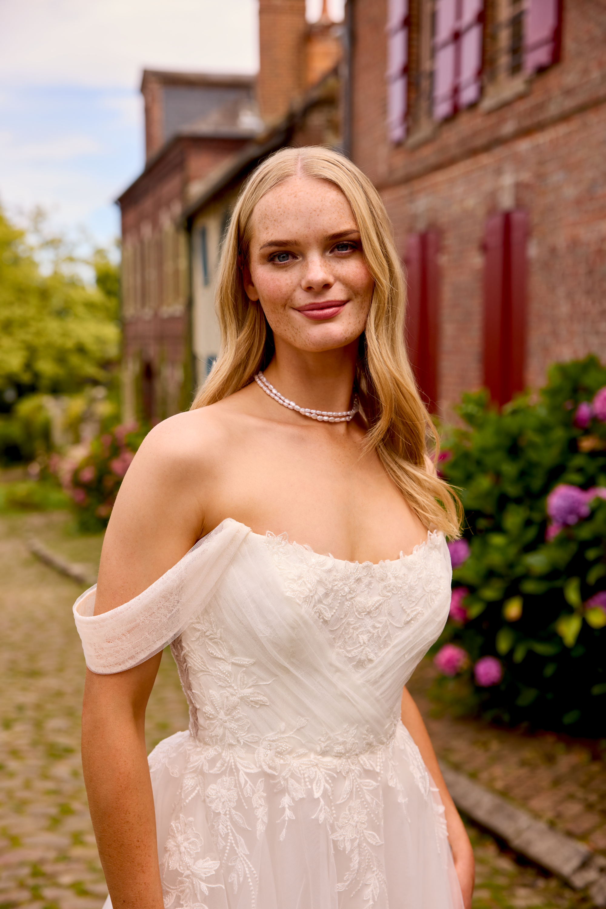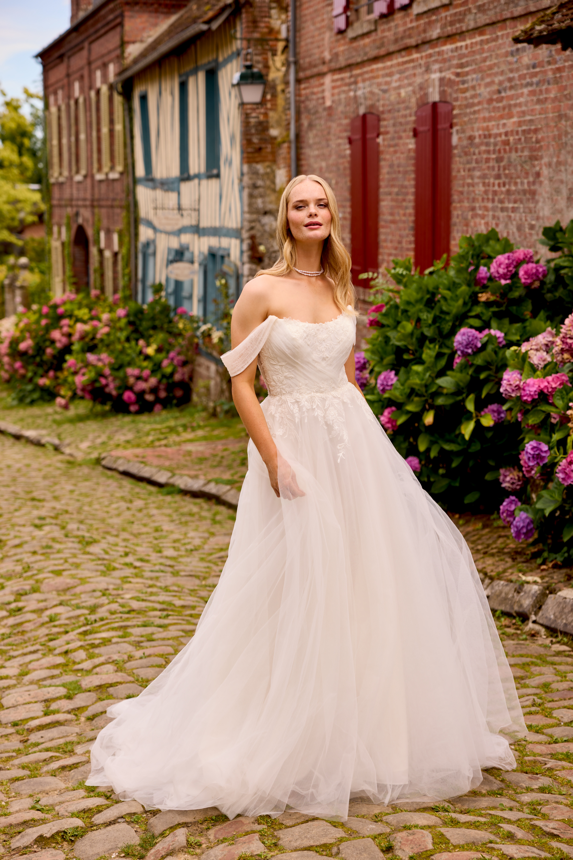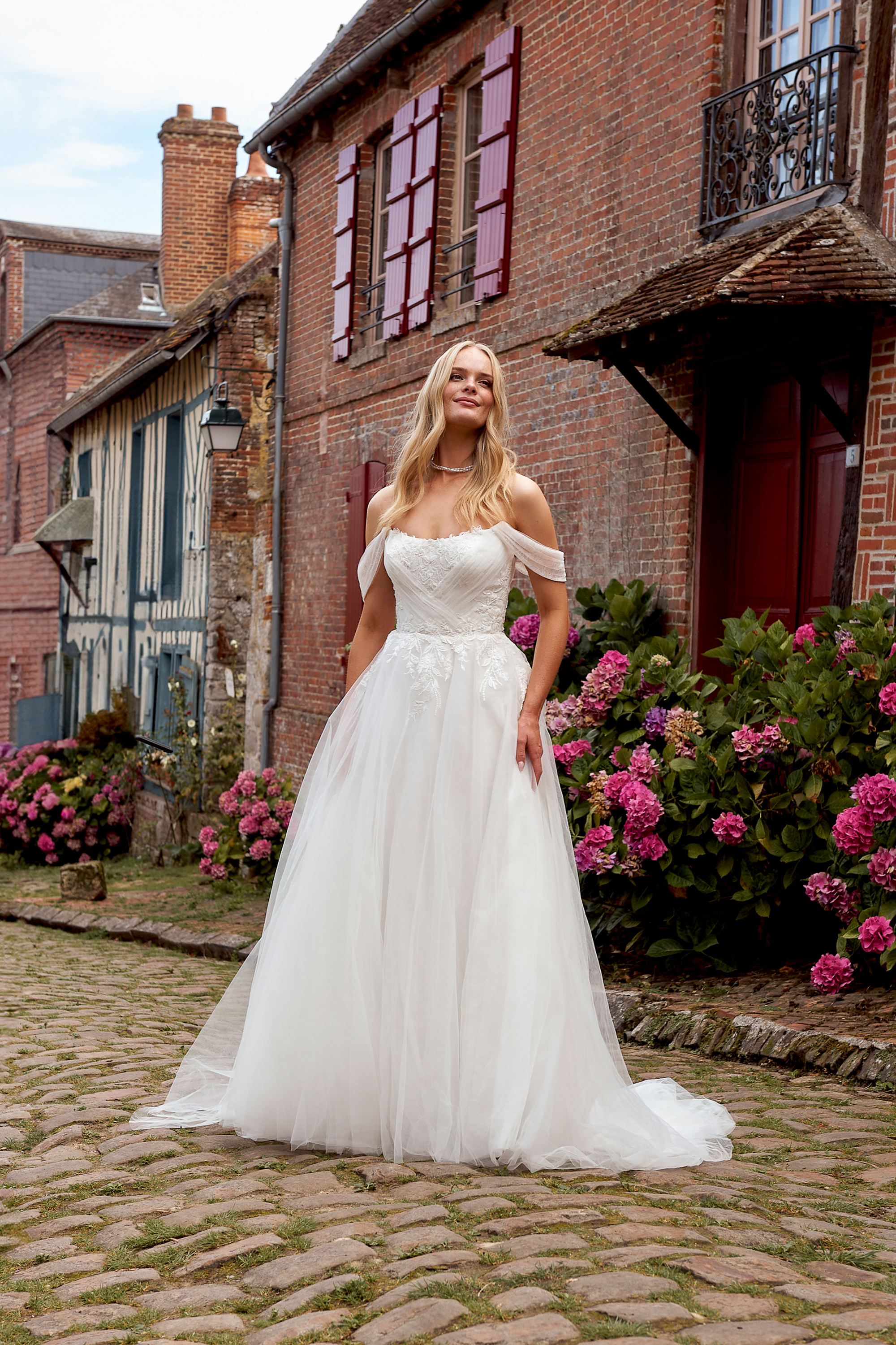 Dieses A-Linien Brautkleid strahlt feminine Leichtigkeit und eine verspielte, romantische Note aus. Die angesagten Carmen-Träger betonen deine Schultern und dein Dekolleté auf besonders schmeichelhafte Weise. Raffinierte Drapierungen aus feinem Tüll formen das Oberteil und verleihen dem Design eine weiche, elegante Struktur.