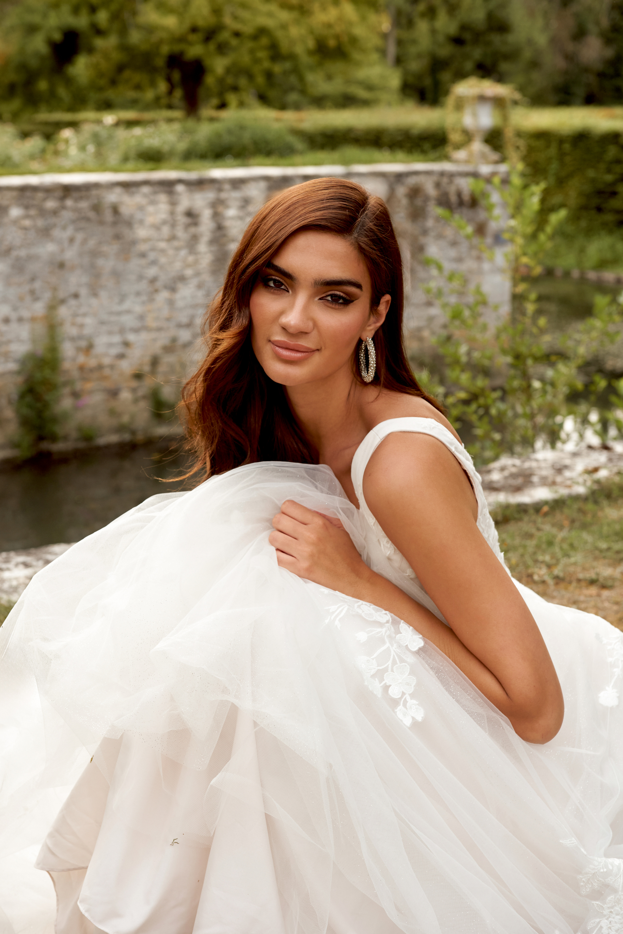 Der weich fallende Tüllrock sorgt für eine traumhafte Bewegung und unterstreicht die feminine Silhouette der A-Linie. Zarte Spitzenapplikationen verteilen sich über den Rock und führen elegant in die lange, fließende Schleppe, die dem Kleid eine besonders edle Wirkung verleiht.