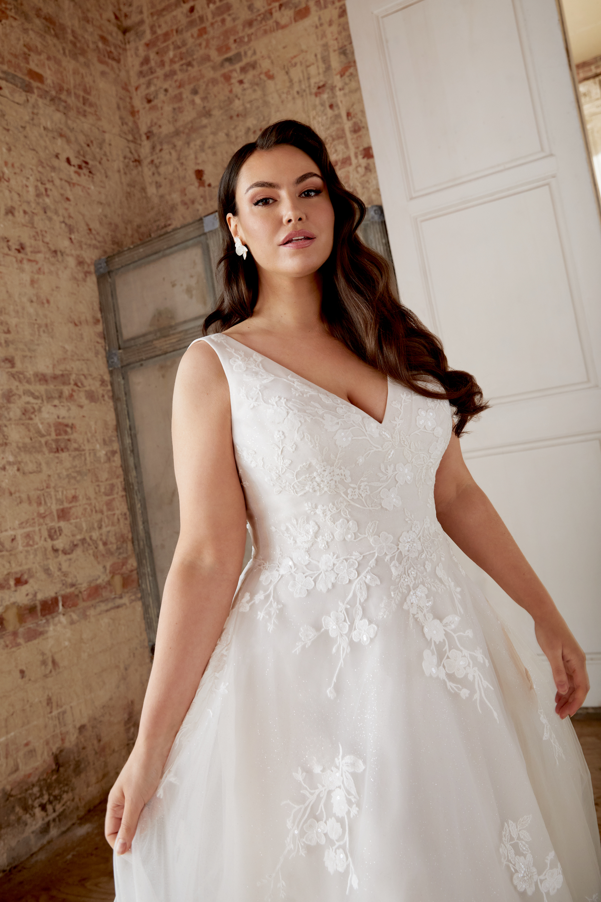 Durch die schmeichelhafte A-Linie eignet sich dieses Brautkleid auch wunderbar für Curvy Brides und Bräute mit weiblichen Formen, da der Schnitt die Taille betont und weich über Hüfte und Rock fällt.