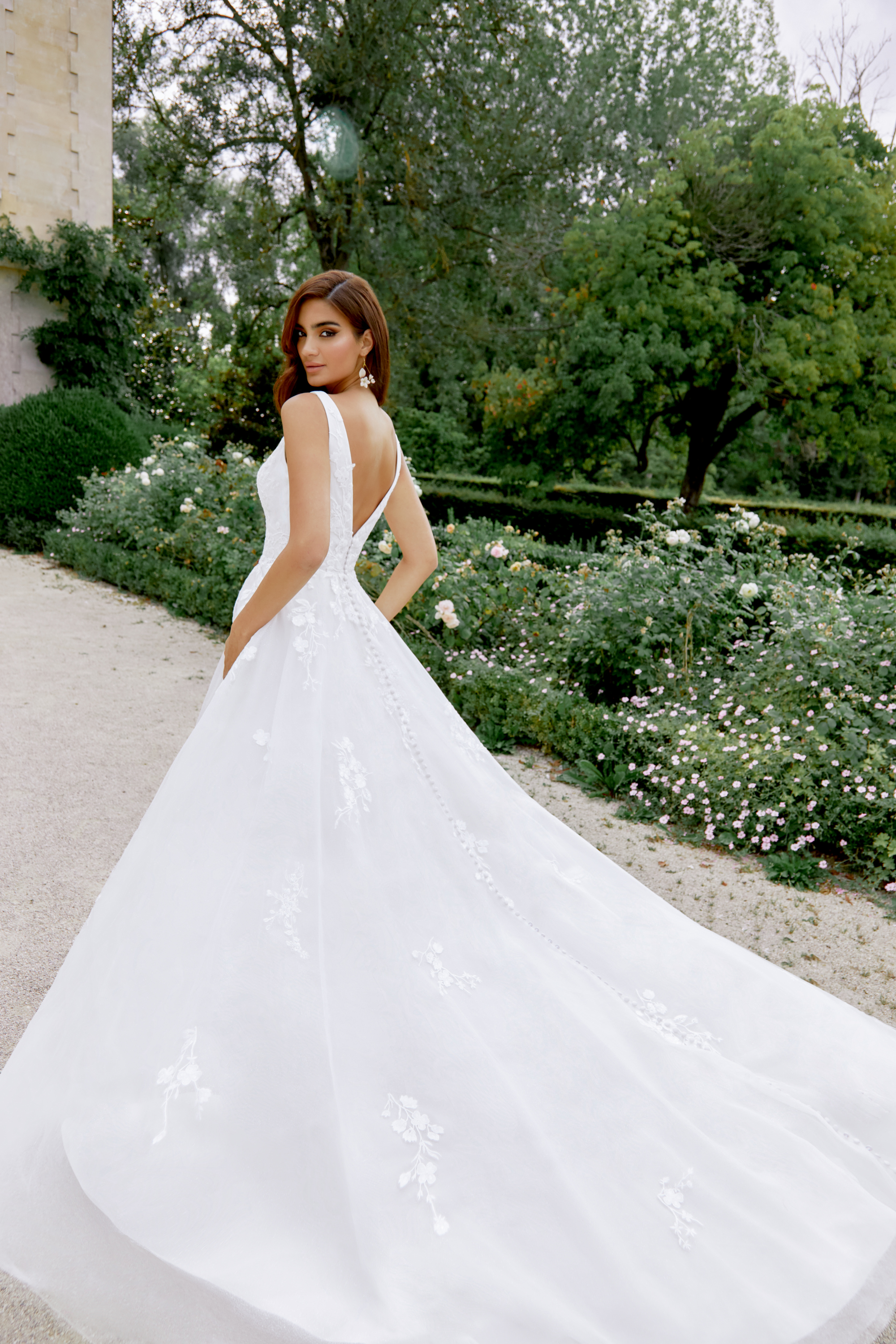Das Oberteil begeistert mit einer transparenten Corsage und einem eleganten V-Ausschnitt, der das Dekolleté feminin in Szene setzt. Filigrane florale Spitzenapplikationen verlaufen harmonisch über das gesamte Oberteil und setzen sich sanft im Rock fort. Die feinen Blütenmotive wirken besonders leicht und verleihen dem Brautkleid eine romantische, natürliche Ausstrahlung.
