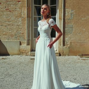 Dieses Brautkleid ist die perfekte Wahl für Bräute, die von einem Auftritt wie aus einem Märchen träumen, ohne dabei auf moderne Akzente und Leichtigkeit verzichten zu wollen. Die Kombination aus zarter Spitze, einem schmeichelhaften Schnitt und einem atemberaubenden Rock macht dieses Kleid zu einer zeitlosen Wahl für jede romantische Braut.
