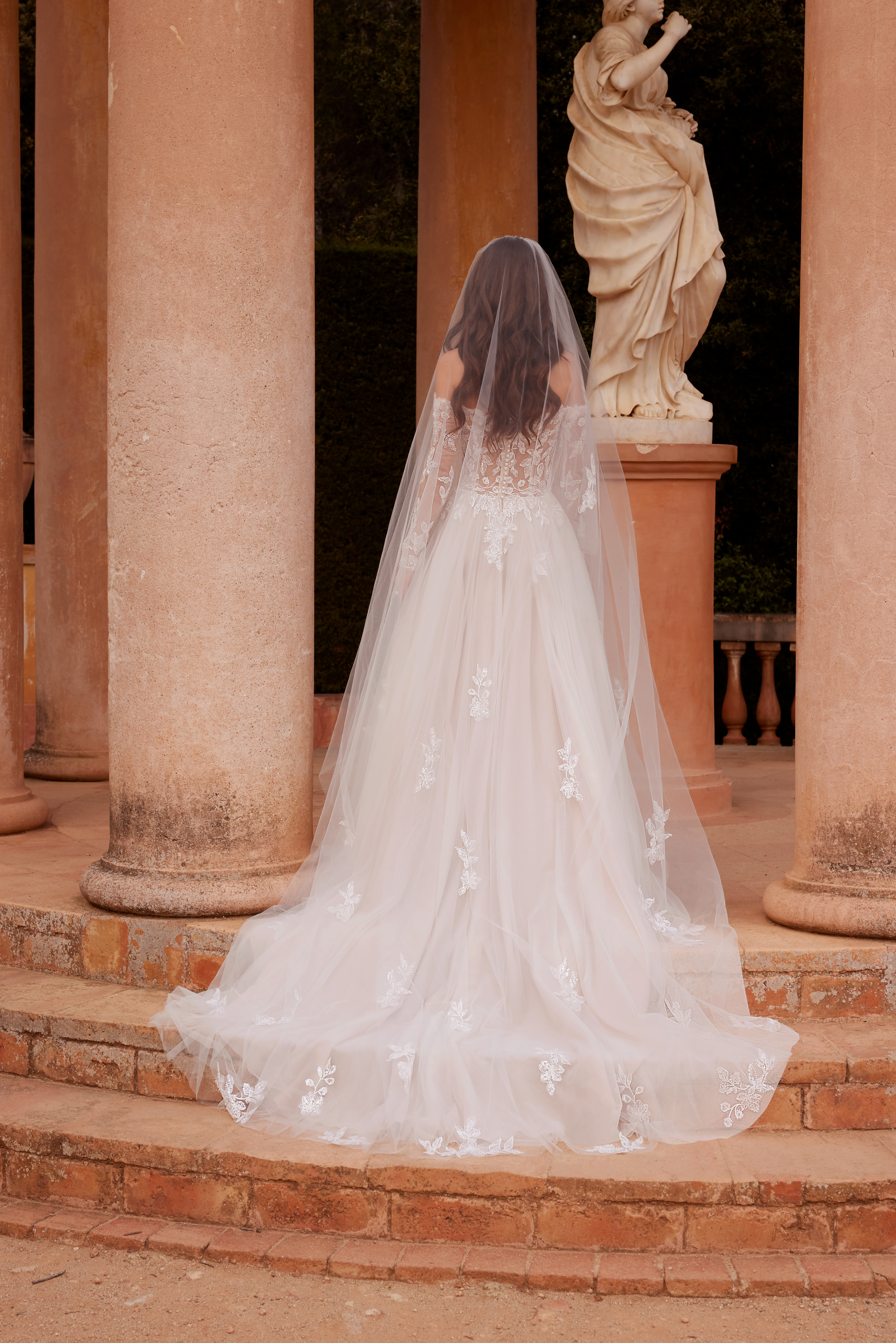 Der Rücken des Kleides ist ein echter Blickfang: Mit einem Illusionsdesign und kunstvoller Spitze gestaltet, sorgt er für eine faszinierende Rückansicht. Die Spitze fließt harmonisch in den weichen Tüllrock über, der für einen majestätischen Auftritt sorgt. Der Rock fällt fließend und leicht und wird durch die feinen Lagen von Tüll zu einem eleganten, voluminösen Traum. Bei jedem Schritt gleitet der Stoff sanft über den Boden und kreiert einen Look, der sowohl anmutig als auch königlich wirkt.