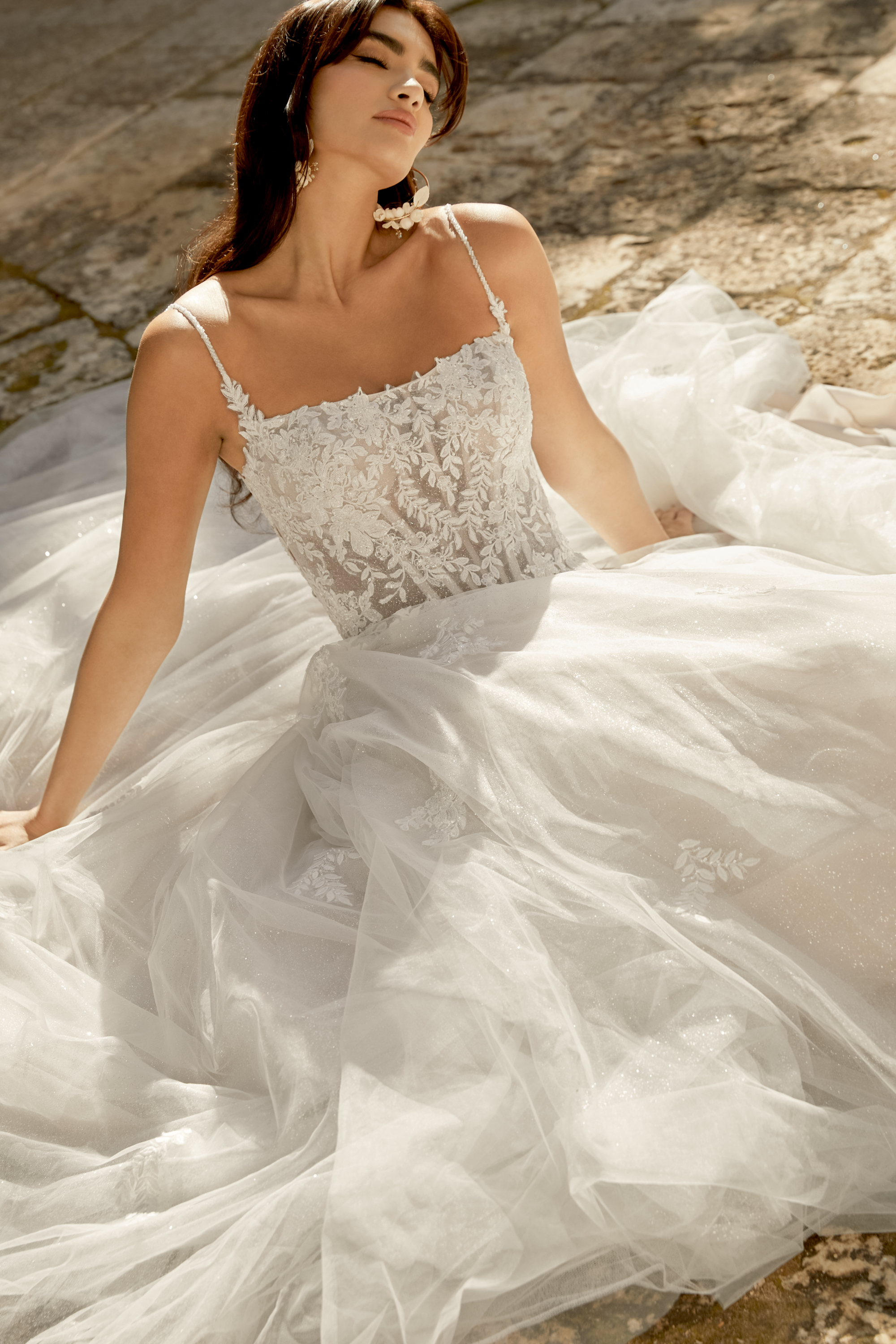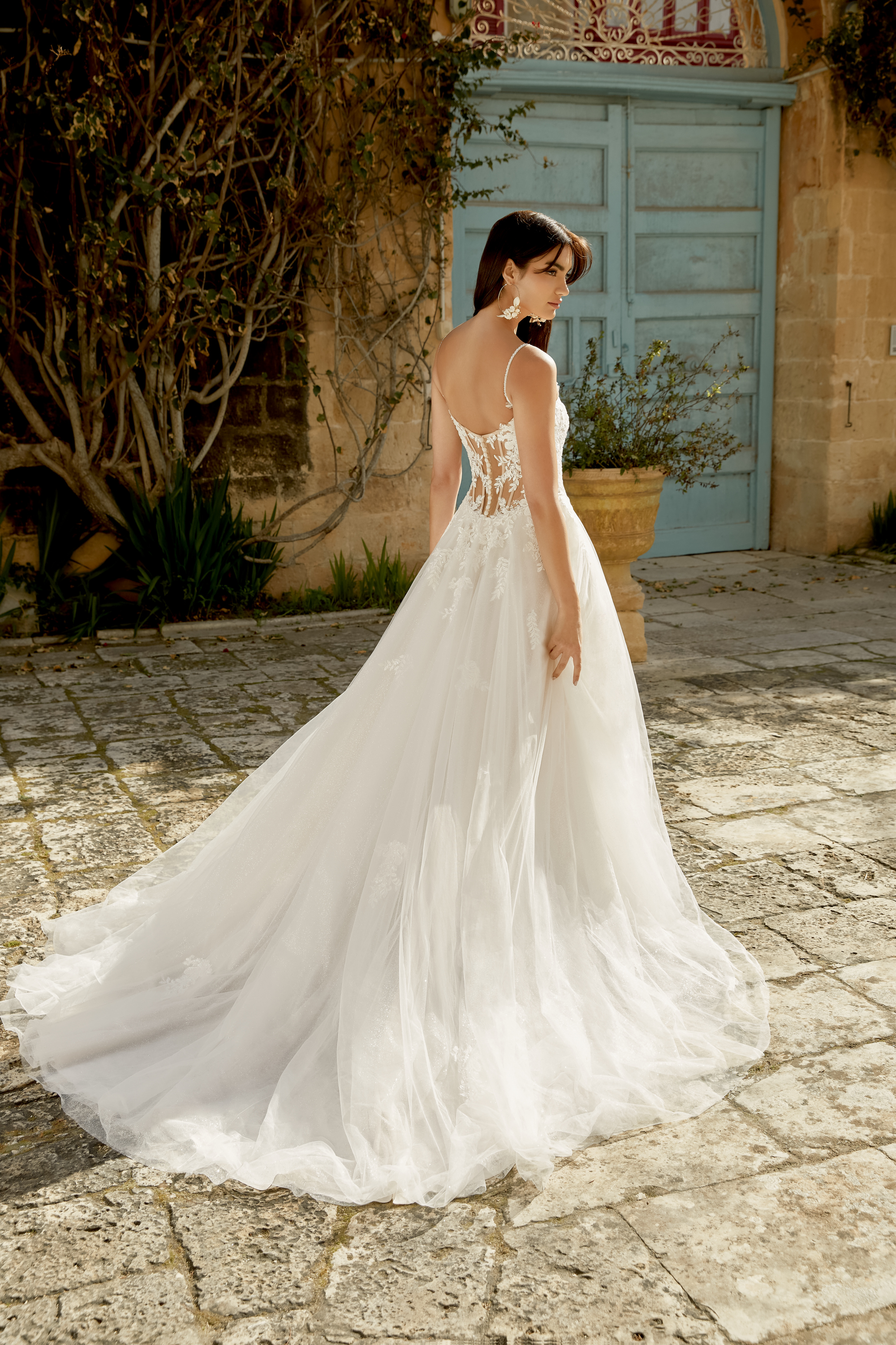 Dieses Kleid ist ideal für Bräute, die sich eine Kombination aus klassischer Eleganz und modernen Akzenten wünschen. Der fließende Tüllrock, die zarten Spitzenapplikationen und der transparente Rücken machen dieses Kleid zu einer perfekten Wahl für eine romantische und stilvolle Hochzeit.
