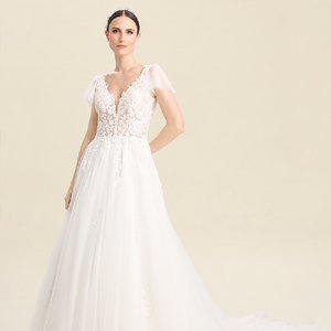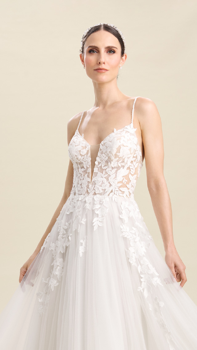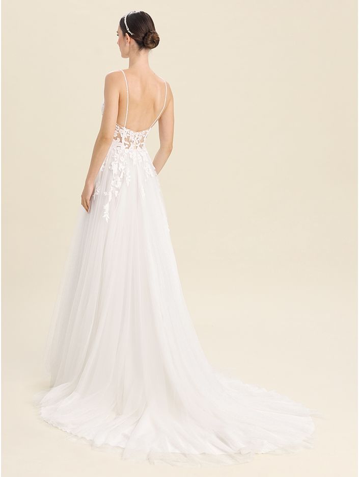 Dieses romantische A-Linien-Brautkleid ist wie gemacht für Dich, wenn Du von einem zarten, glitzernden Fairy-Tale-Look träumst – modern, leicht und unglaublich feminin. Das Oberteil des Brautkleides begeistert mit glitzernder Spitze, die im angesagten Corsagen-Look auf dem Oberteil drapiert ist. Der tiefe Herz-Ausschnitt und die feinen Spaghetti-Träger sorgen für eine elegante, sanft verführerische Silhouette und lassen das Brautkleid gleichzeitig wunderbar leicht wirken.