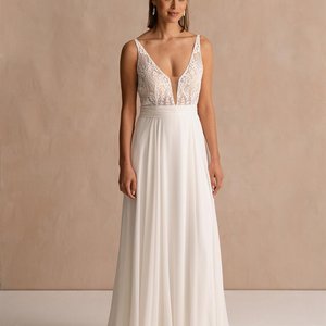 Dieses Brautkleid ist die perfekte Wahl für Bräute, die sich einen romantischen und verträumten Look für ihren großen Tag wünschen. Das Modell überzeugt durch seine zarte Kombination aus einem floralen Spitzenoberteil und einem fließenden Tüllrock, der bei jedem Schritt anmutig mitschwingt und für eine leichte, luftige Silhouette sorgt.