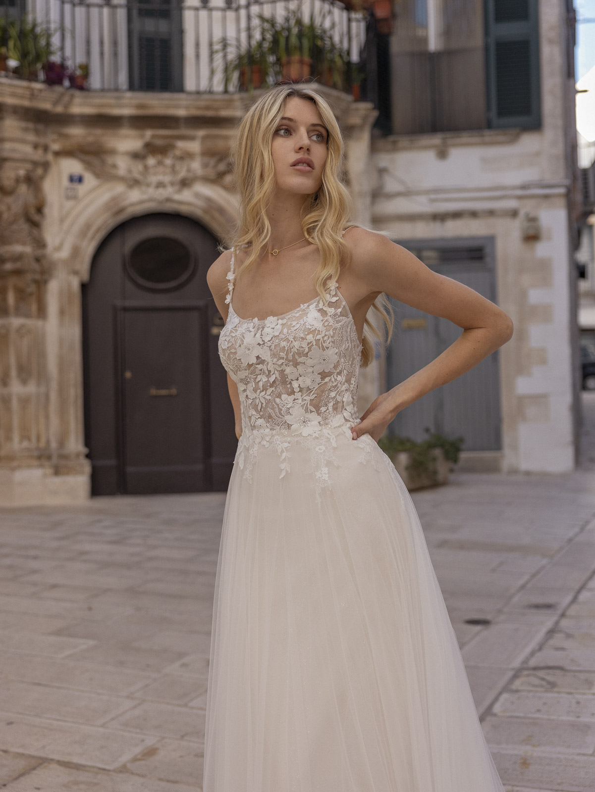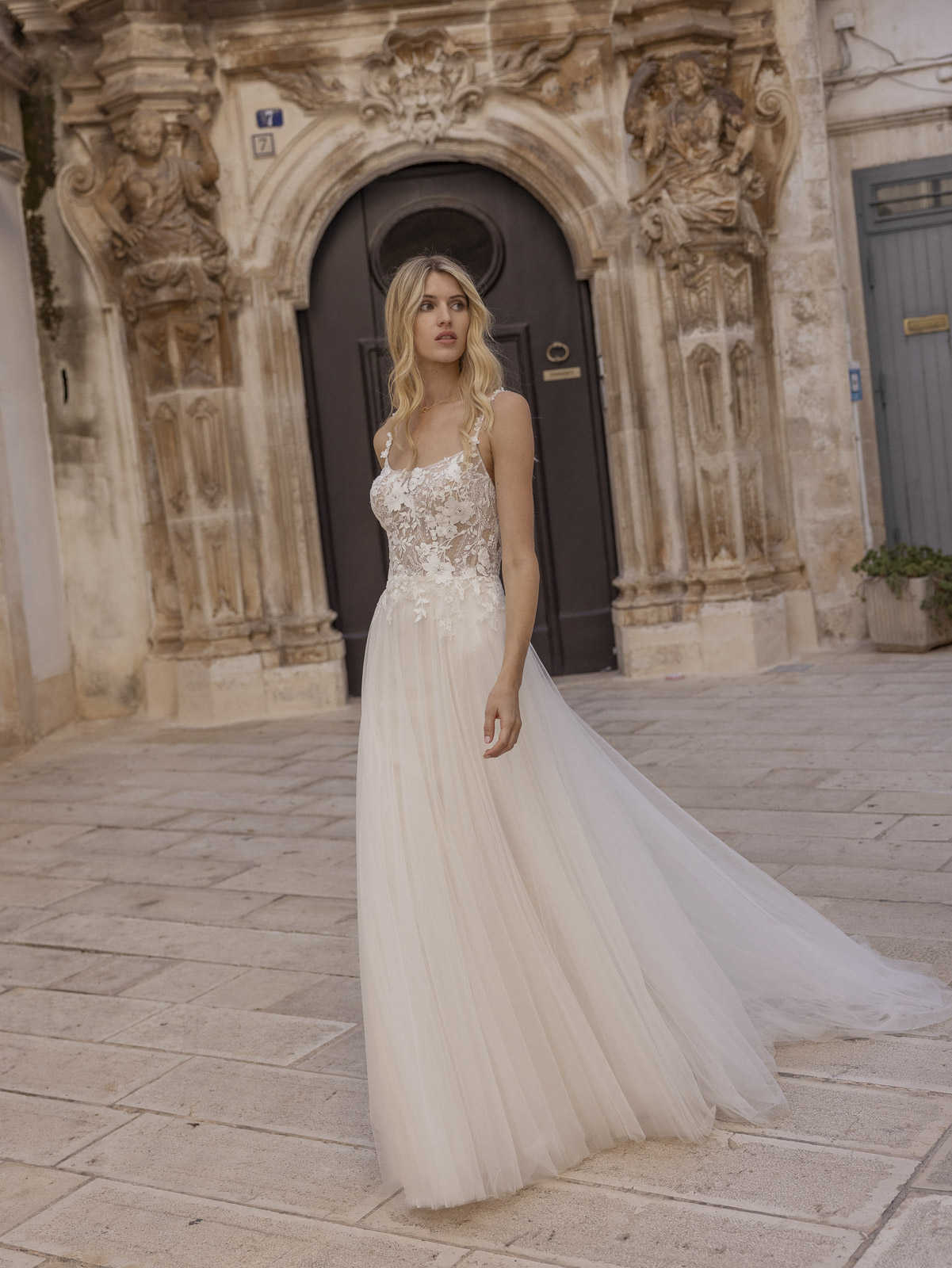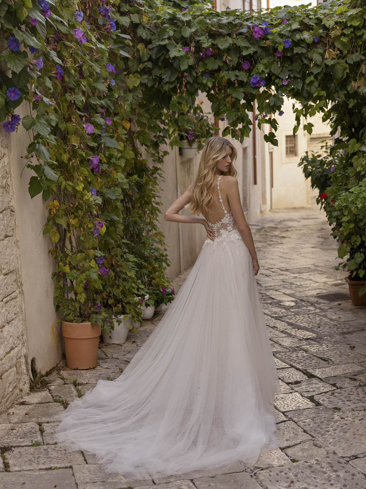 Das faszinierende Mieder, kunstvoll gefertigt aus zarter Illusionsspitze, umhüllt die Braut mit einem klassischen Rundhalsausschnitt und bezaubernden Spitzenträgern. Ein Hauch von zeitloser Romantik bahnt den Weg zu einem verführerisch offenen Rücken und verleiht dem Kleid eine sinnliche Tiefe, die die Herzen höher schlagen lässt.