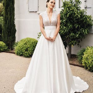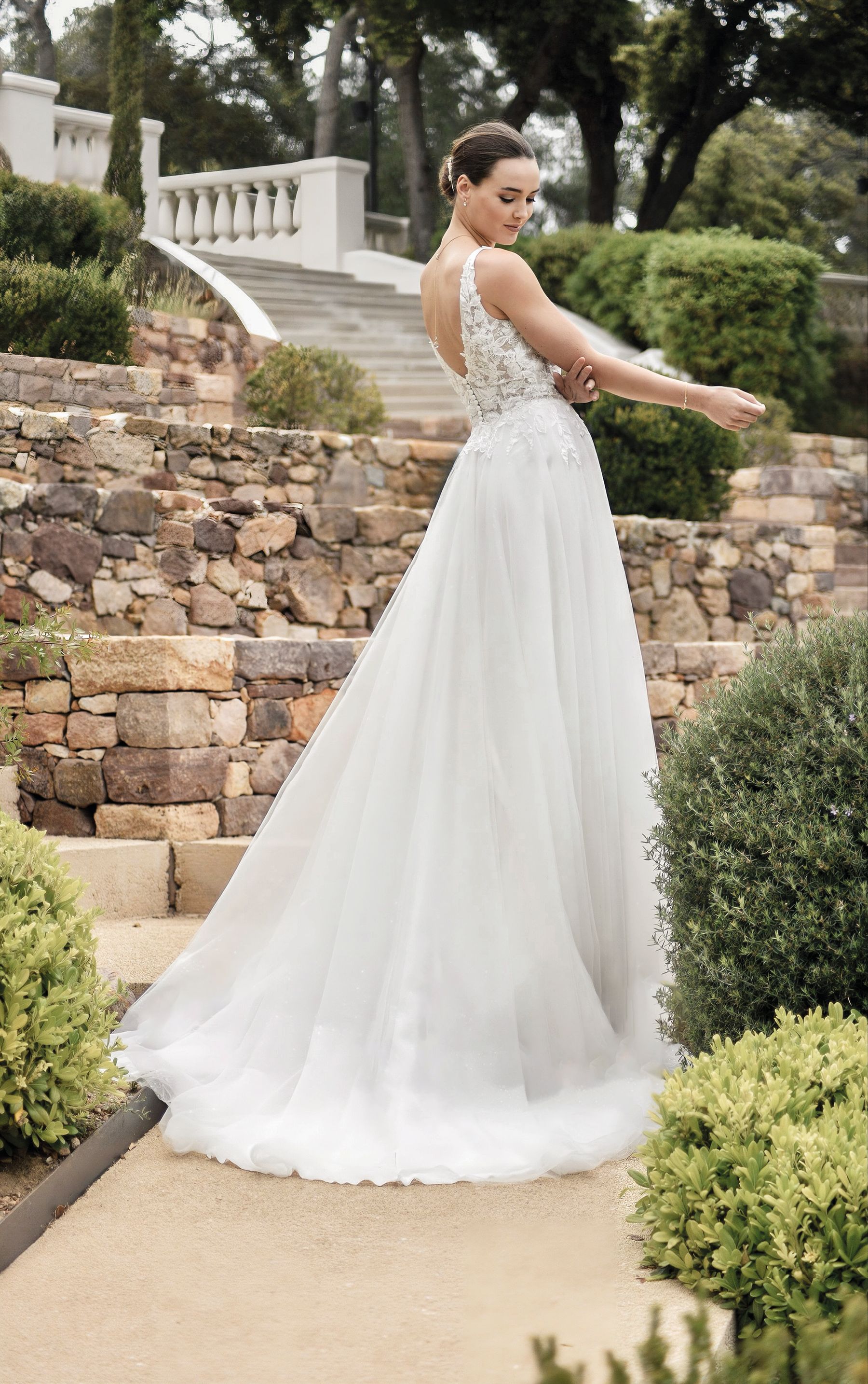 Dieses traumhafte Brautkleid vereint klassische Eleganz mit einem Hauch von moderner Raffinesse. Das Oberteil des Kleides besticht durch zarte Spitzenapplikationen, die einen romantischen und zugleich edlen Look erzeugen. Die Spitze setzt sich über die Träger hinweg fort und schafft so einen nahtlosen Übergang zum Rücken, der durch seine klare und elegante Gestaltung ins Auge fällt. Der tiefe Ausschnitt verleiht dem Kleid eine sinnliche Note und sorgt dafür, dass die Silhouette der Braut optimal betont wird.