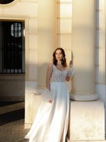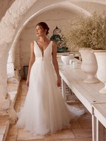 Das Highlight: der Tüll-Rock mit Schlitz. Er sorgt für traumhafte Bewegungen beim Gehen und Tanzen und lässt gleichzeitig Deine Beine subtil zur Geltung kommen. Durch den fließenden Stoff wirkt das Kleid herrlich leicht – ein Traum für eine Sommerhochzeit, aber auch absolut passend für jede andere Jahreszeit.