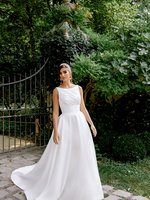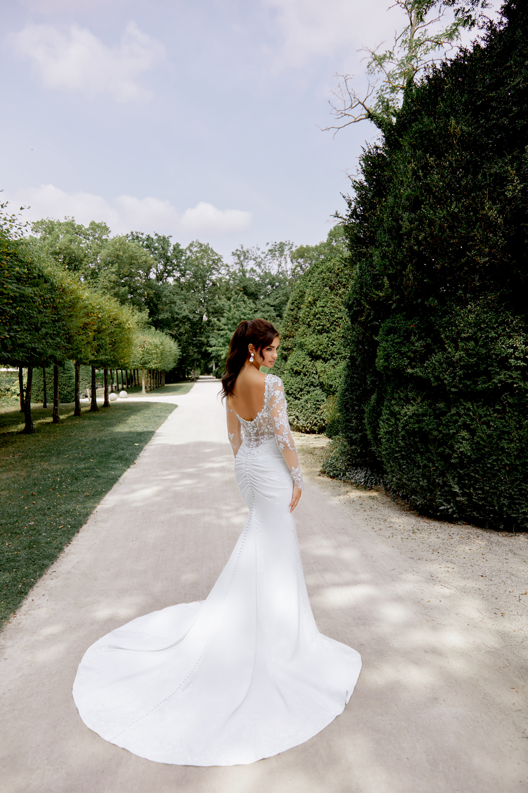 Der Rock aus glattem Crêpe bringt Ruhe ins Design und bildet einen modernen Kontrast zur detailreichen Spitze. Die Schleppe rundet den glamourösen Auftritt ab – perfekt für Deinen großen Moment am Altar.