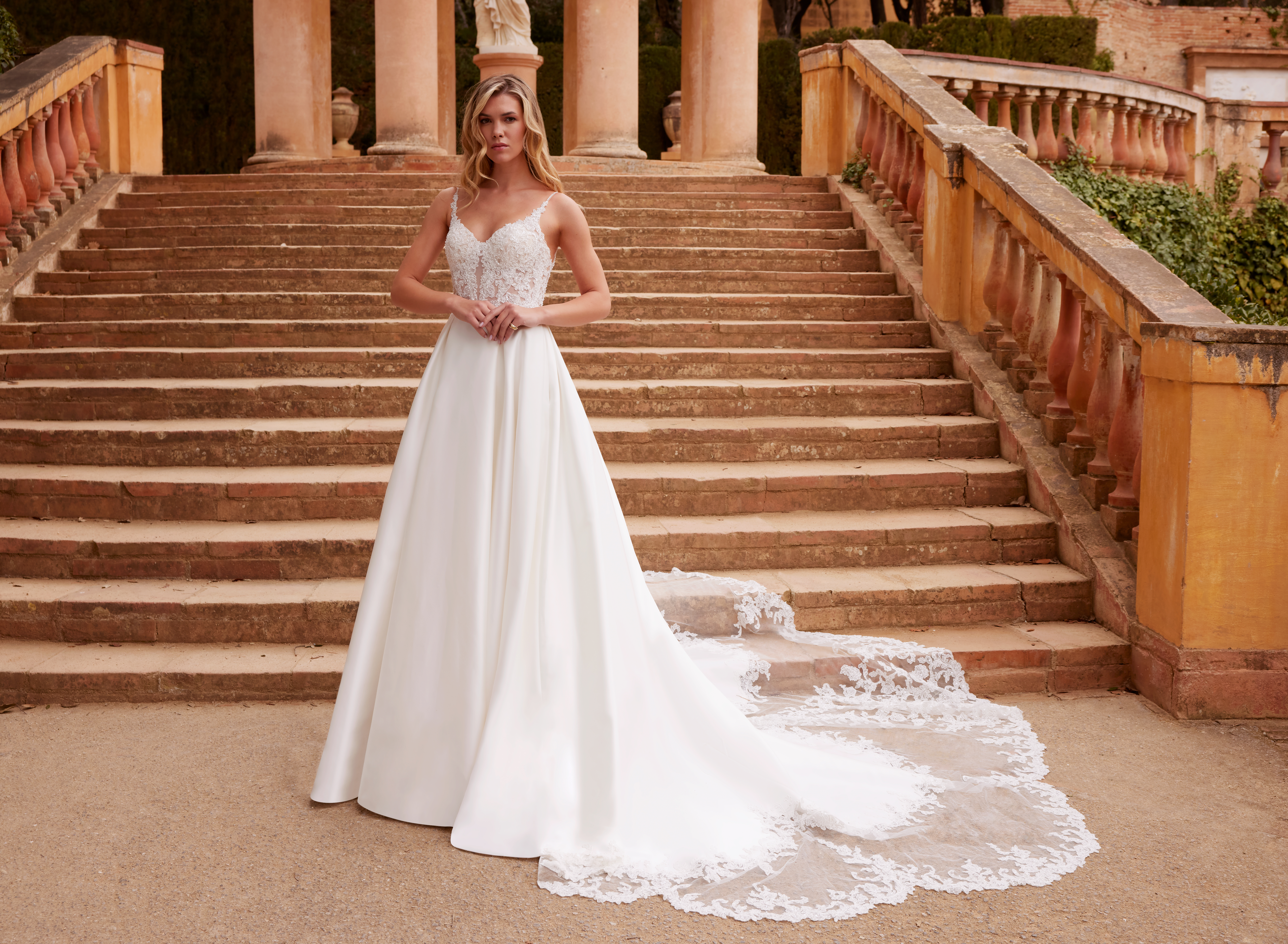 Dieses Kleid ist das Highlight für Bräute, die einen opulenten Look suchen und dabei nicht auf Details verzichten möchten. Die Kombination aus luxuriösem Satin und feiner Spitze verleiht dem Kleid eine zeitlose Eleganz, die sowohl in einer großen Kathedrale als auch auf einem Schloss perfekt zur Geltung kommt.