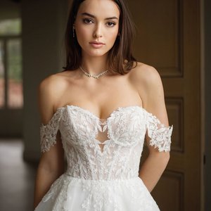 Dieses Brautkleid vereint schlichte Eleganz mit moderner Raffinesse und ist ideal für die Braut, die an ihrem besonderen Tag sowohl zeitlose Schönheit als auch Stilbewusstsein ausstrahlen möchte. Das Oberteil des Kleides beeindruckt durch einen tiefen V-Ausschnitt, der von zarten Spitzenapplikationen eingefasst wird. Diese Applikationen ziehen sich über die Schultern bis zum Rücken, wo sie in einem eleganten, tiefen Rückenausschnitt auslaufen. Die Spitze verleiht dem Kleid eine romantische Note und unterstreicht die feminine Silhouette der Braut.
