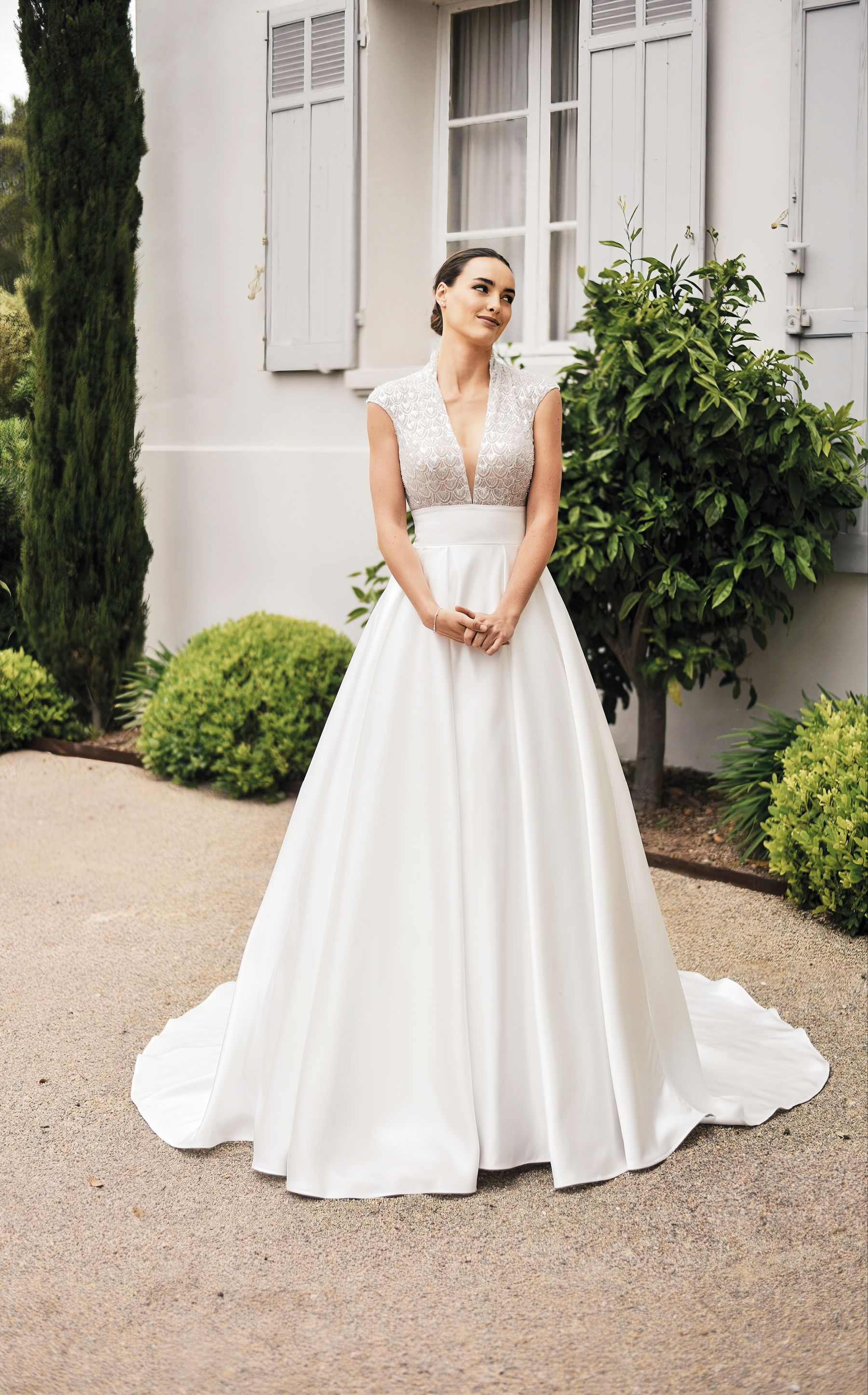 Ein besonderes Highlight ist der Kontrast zwischen dem reich verzierten Oberteil und dem glatten, minimalistischen Rock, was dieses Kleid zu einer perfekten Wahl für die moderne Braut macht, die auf subtile Details und hochwertige Materialien Wert legt. Der tiefe Rückenausschnitt sorgt für einen atemberaubenden Rückblick und lässt die Braut sowohl von vorne als auch von hinten in vollem Glanz erstrahlen.: