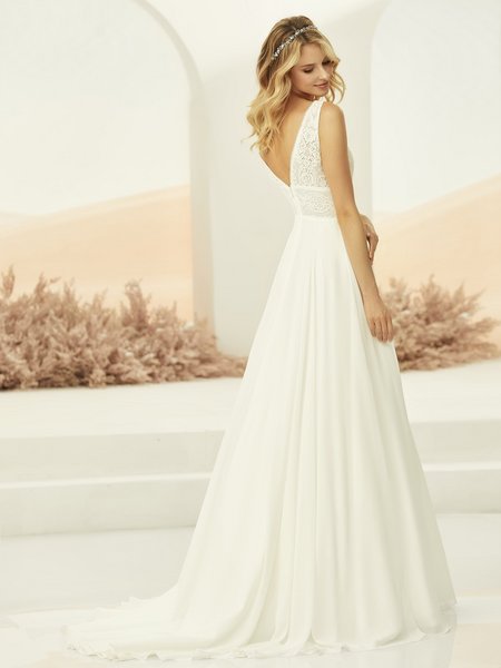 Die Kombination aus zarter Illusionsspitze und leichtem Chiffon verleiht dem Kleid eine besondere Eleganz, die perfekt zu einer schlichten Vintage-Hochzeit passt. Der V-Ausschnitt vorne und hinten betont das Dekolleté und den Rücken auf dezente Weise und sorgt für eine charmante Silhouette.