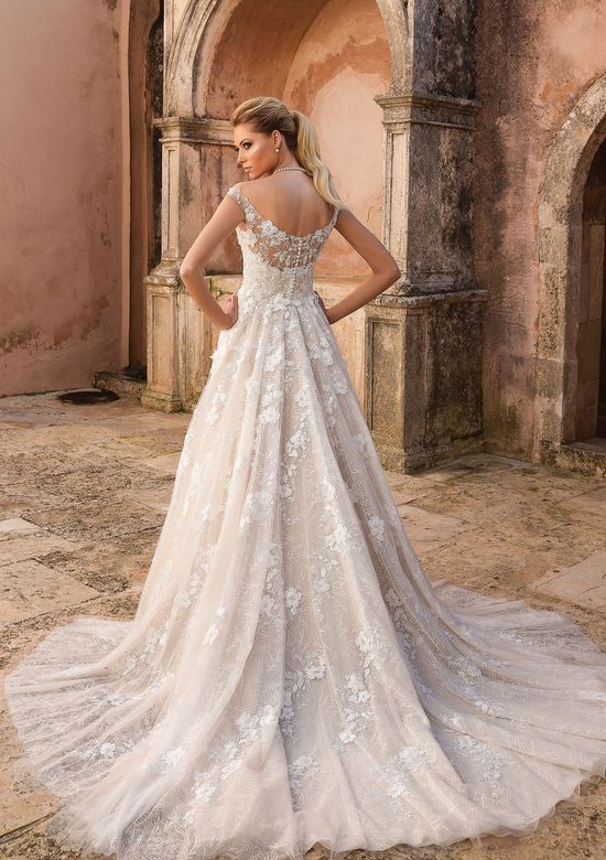 Dieses Kleid ist aus Spitze mit 3D-Blumenapplikationen. Knopf- und Schleifenverschlüsse zieren den Rücken.