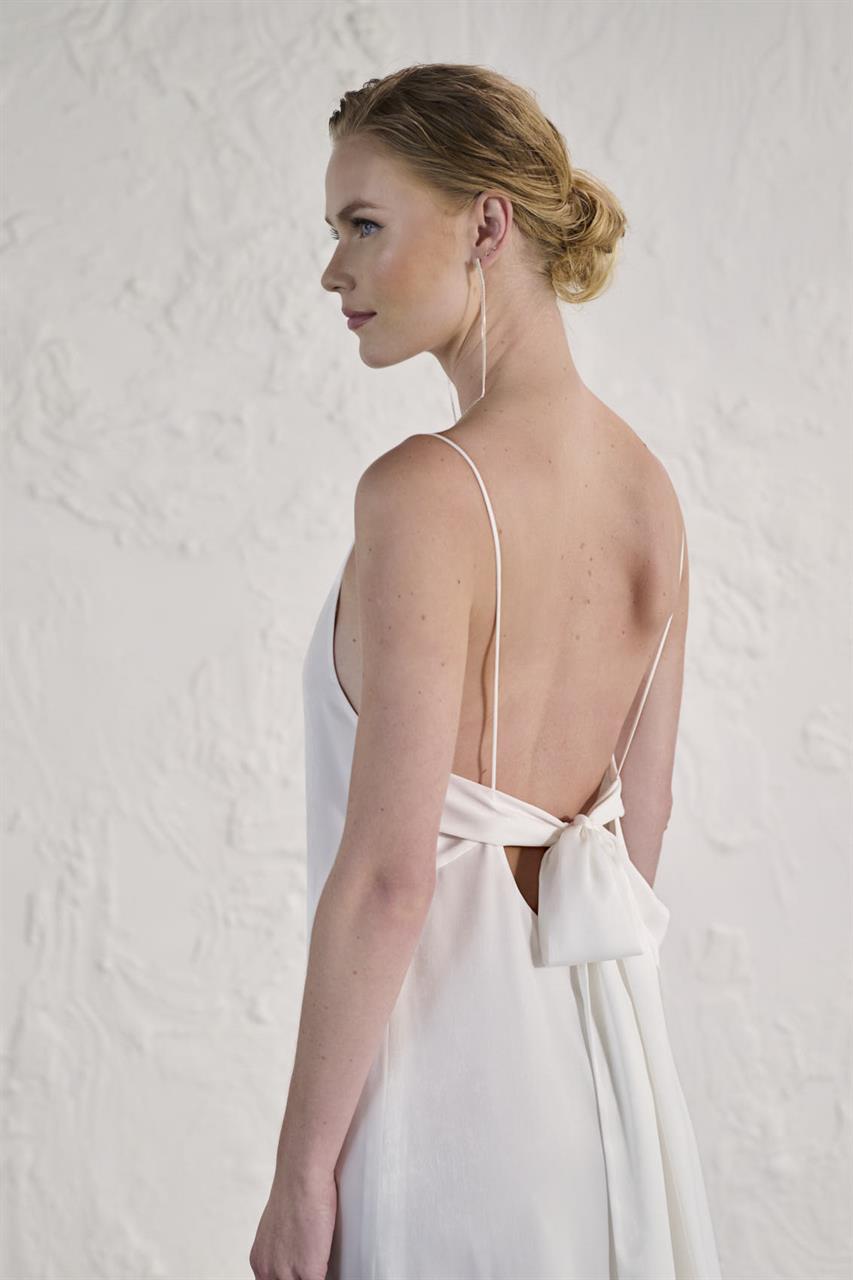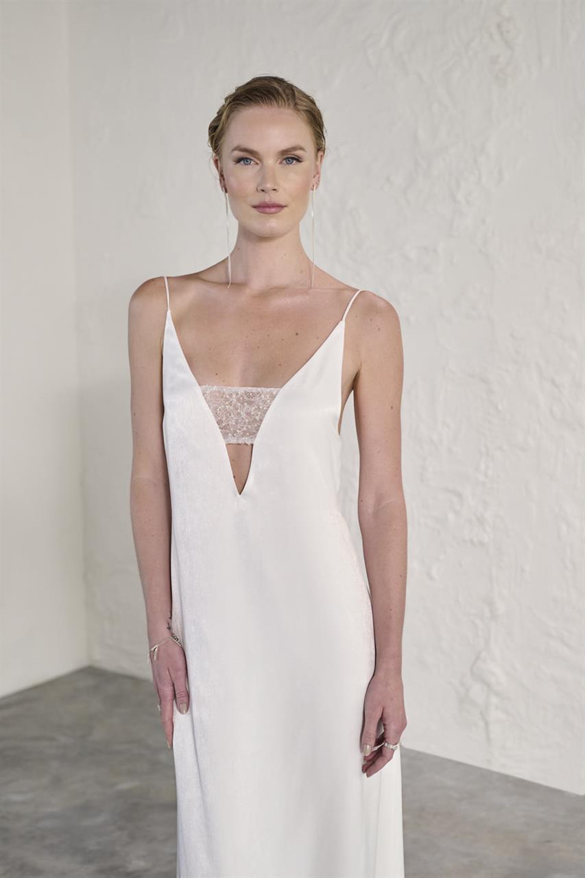 Mit einer dezenten Schleppe, die das Kleid stilvoll abrundet, ist dieses Slip-Dress die perfekte Wahl für die moderne Braut, die Luxus und Verführung miteinander verbinden möchte. Dieses Kleid vereint mühelos Eleganz, Glamour und Sinnlichkeit und sorgt dafür, dass die Braut an ihrem besonderen Tag im Mittelpunkt steht.