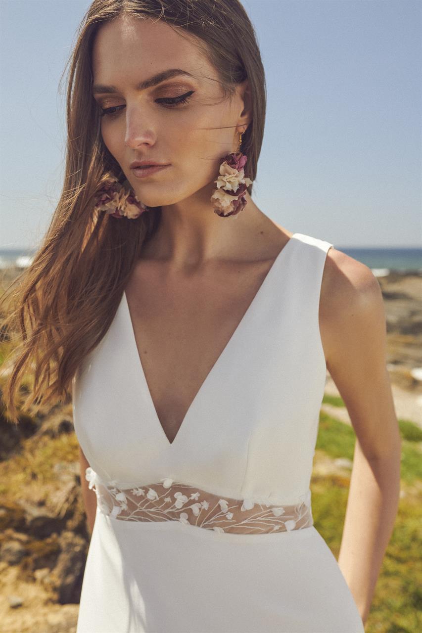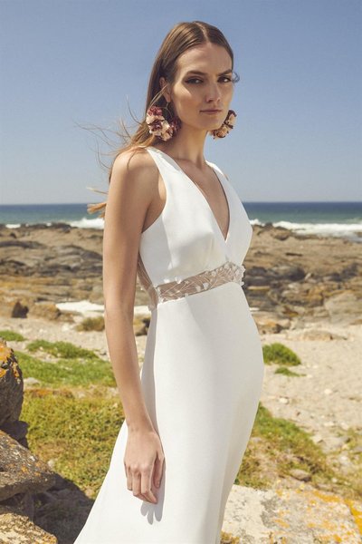 Dieses zauberhafte Vintage-Brautkleid, genannt Nutelo, ist eine Verkörperung zeitloser Eleganz und wurde aus nachhaltigem Krepp gefertigt. Der V-Ausschnitt erstreckt sich sowohl vorne als auch hinten und verleiht dem Oberteil eine anmutige Ausstrahlung. Ein Hauch von Transparenz und Raffinesse wird durch ein besticktes Tüllband betont, das die Taille umschmeichelt und auf der Rückseite des Kleides für eine bezaubernde Note sorgt. Der Rock präsentiert eine leichte A-Linien-Passform, die sich zu einer dezenten Schleppe hin öffnet, und vervollständigt das Gesamtbild mit einer harmonischen Fusion aus Stil und Nachhaltigkeit.