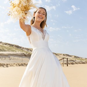 Dieses zauberhafte Brautkleid verkörpert romantische Eleganz und lässt Dich an Deinem großen Tag in voller Pracht erstrahlen. Mit seinem herzförmigen Bustier und den zarten Trägern aus floraler Spitze, die mit funkelnden Pailletten besetzt sind, strahlt das Kleid sowohl Romantik als auch Glamour aus. Die feinen Pailletten verleihen dem Kleid einen dezenten Glanz und fangen bei jedem Lichtstrahl das Leuchten ein, was für einen funkelnden Auftritt sorgt.