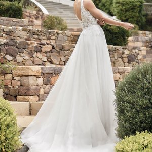 Die eingearbeiteten Push-ups in der Korsage sorgen für eine perfekte Passform und bieten optimalen Halt, sodass Du Dich den ganzen Tag über wohlfühlst und sicher auftreten kannst. Die lange Schleppe rundet das Kleid majestätisch ab und sorgt für einen eindrucksvollen Auftritt beim Gang zum Altar.