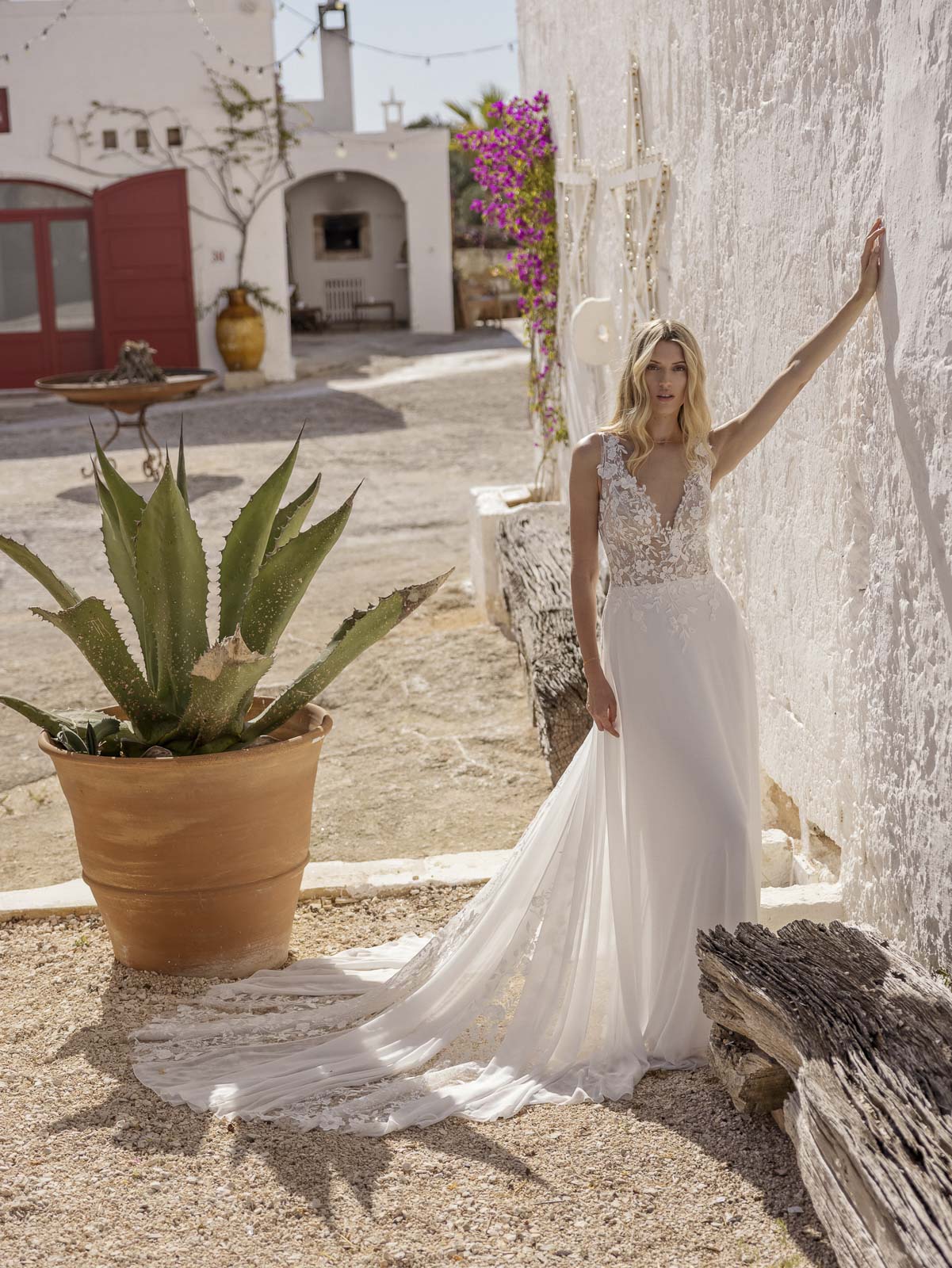 Der Rücken, kunstvoll mit Illusionsspitze gestaltet, zaubert einen verführerischen Tattoo-Effekt, der die Romantik dieses Moments unterstreicht. Der Gang zum Altar wird somit zu einem unvergesslichen Auftritt, der nicht nur dich, sondern auch deine Gäste begeistern wird.