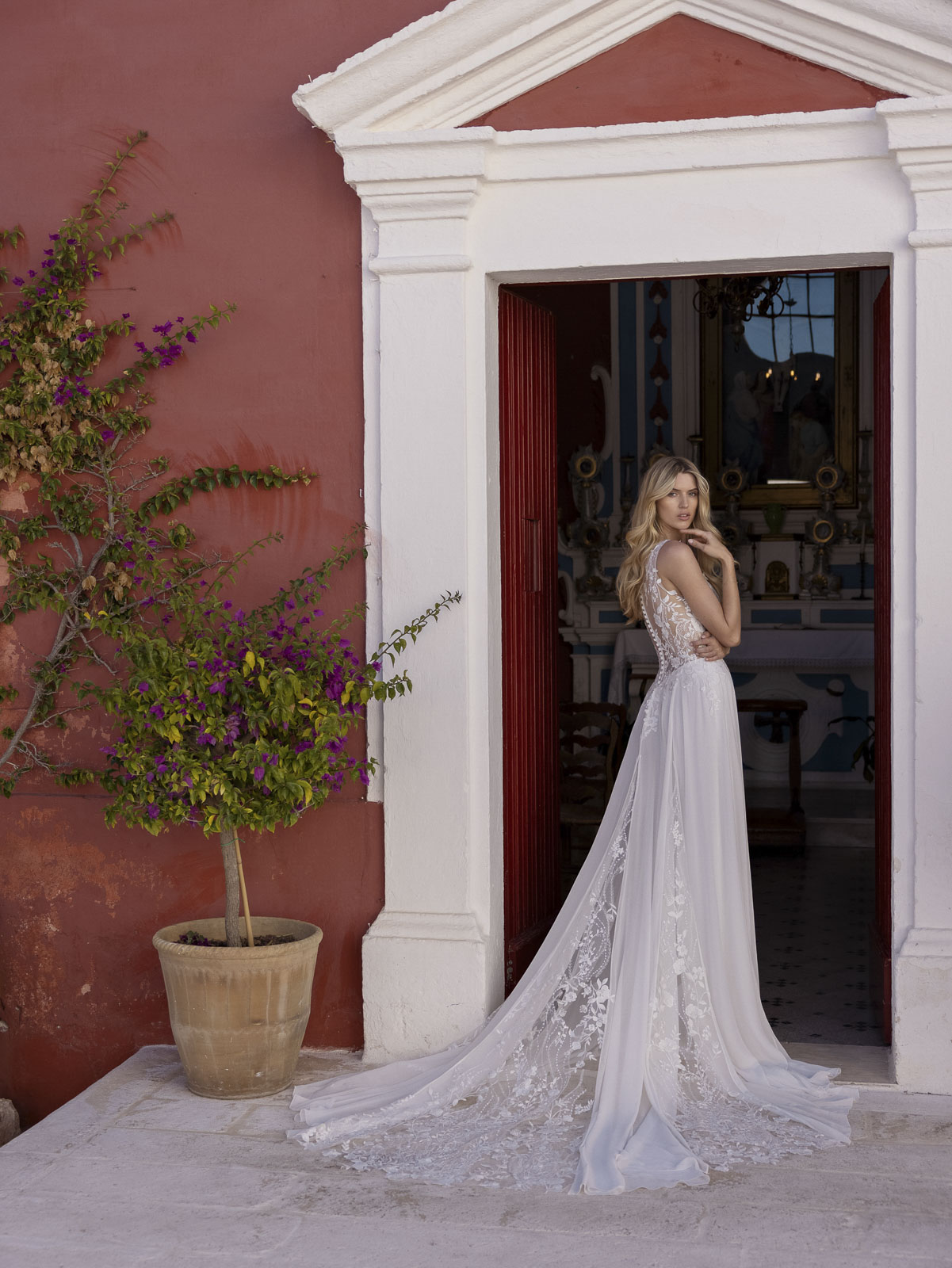 Die Spitzendetails am Rock setzen einen zauberhaften Akzent und vollenden diesen beeindruckenden Braut-Look. Jede einzelne Nuance dieses Kleides erzählt deine persönliche Liebesgeschichte und macht den Tag deiner Hochzeit zu einem unvergleichlichen Kapitel in deinem Leben.
