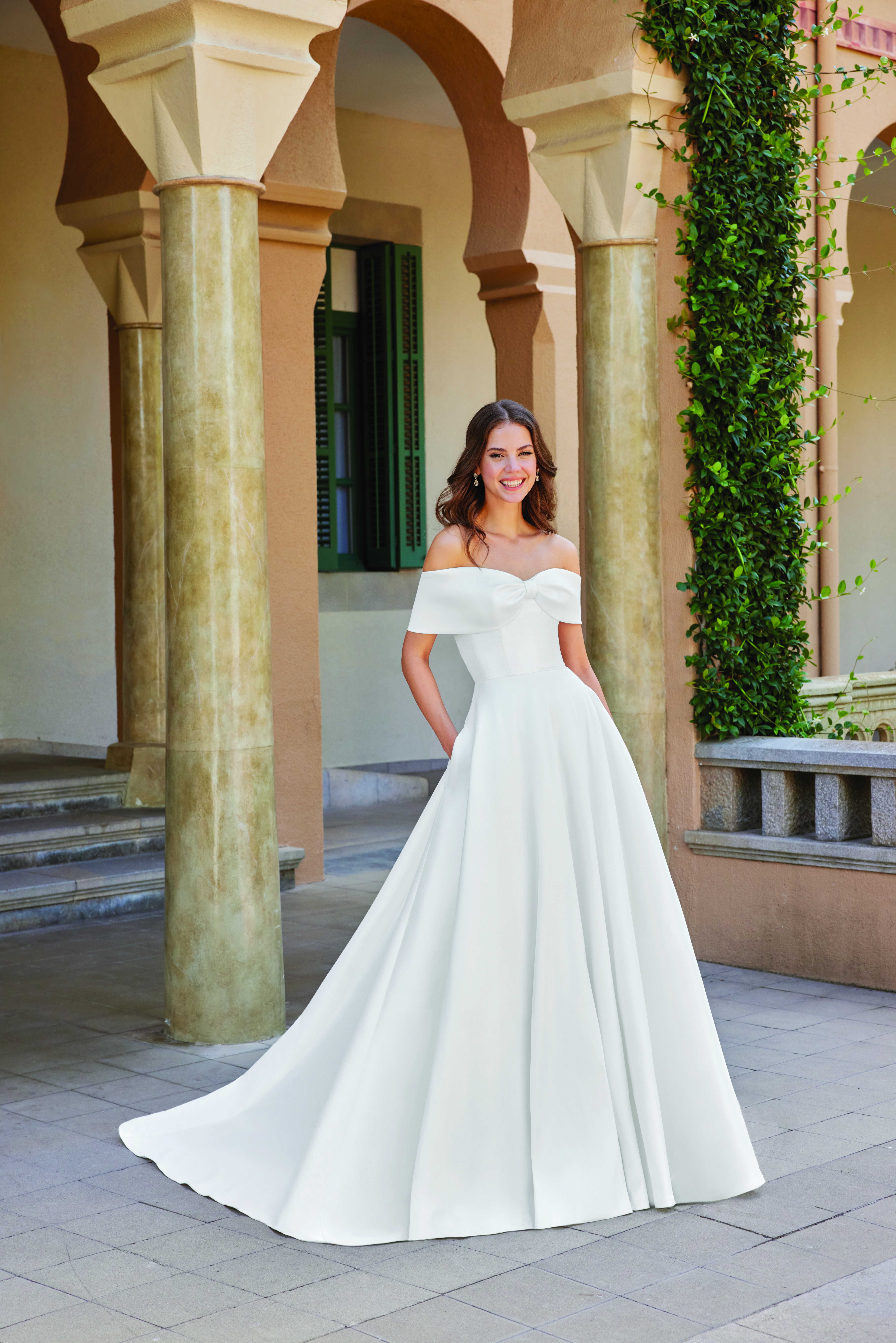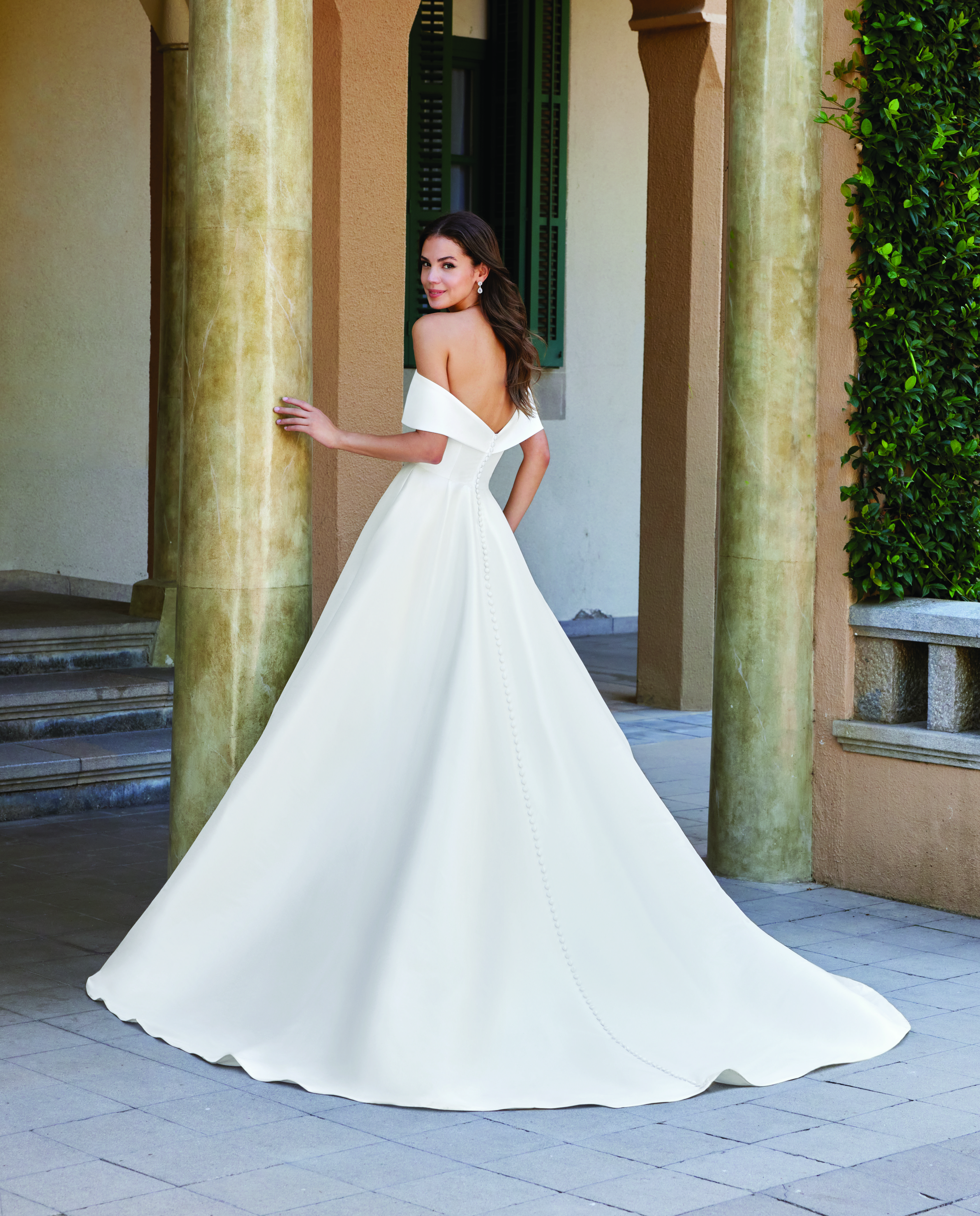 Dieses atemberaubende Prinzessinnen-Brautkleid aus luxuriösem Mikado-Stoff vereint klassische Eleganz mit einem modernen, minimalistischen Design. Der schulterfreie Ausschnitt wird durch eine wunderschön drapierte Schleife akzentuiert, die dem Oberteil eine besondere Raffinesse verleiht. Die klare, schlichte Linienführung des Kleides betont die natürliche Schönheit der Braut, während die feine Struktur des Mikado-Stoffs für einen eleganten, glatten Fall sorgt.