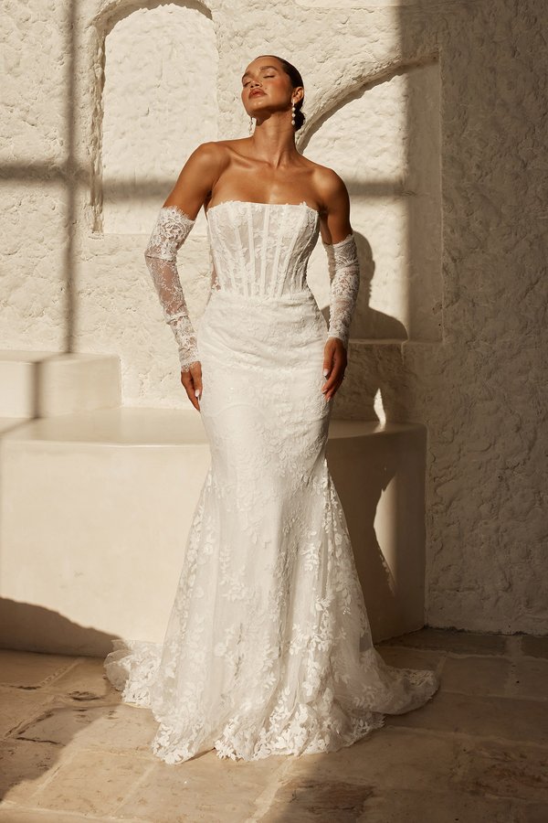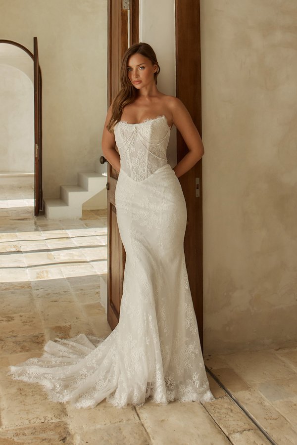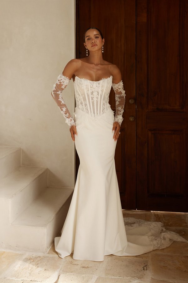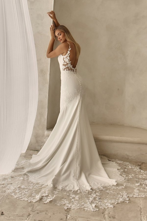 Dieses Fit & Flare Brautkleid vereint moderne Raffinesse mit einer sinnlich-eleganten Ausstrahlung. Der figurbetonte Schnitt folgt sanft den Linien des Körpers und öffnet sich ab dem Knie in eine fließende Schleppe – feminin, selbstbewusst und voller Leichtigkeit. Das Brautkleid ist vollständig aus feiner Spitze gearbeitet und wirkt dadurch besonders harmonisch und hochwertig. Der gerade Ausschnitt verleiht dem Oberteil eine klare, moderne Linie und setzt das Dekolleté stilvoll in Szene. In die Spitze sind dezente Pailletten eingearbeitet, die bei Bewegung sanft schimmern und dem Kleid eine elegante Tiefe verleihen, ohne aufdringlich zu wirken. Seitliche Cut-outs, kunstvoll mit Spitze veredelt, sorgen für einen raffinierten Akzent und unterstreichen die moderne Ausstrahlung des Designs. Sie geben dem Kleid Leichtigkeit und lassen es gleichzeitig besonders feminin und individuell wirken. Der Rock folgt der Figur in fließender Linie und geht harmonisch in eine zarte Schleppe über. Die durchgehende Spitze sorgt für ein ruhiges Gesamtbild und verbindet alle Elemente zu einem stilvollen, ausdrucksstarken Look. Dieses Fit & Flare Brautkleid ist ideal für zukünftige Bräute, die klare Formen lieben und dennoch nicht auf besondere Details und eine sinnliche Eleganz verzichten möchten. Bei Cinderella Brautmode Köln entfaltet dieses Kleid seine ganze Wirkung – in einer Atmosphäre, die Raum für Gefühl, Persönlichkeit und Deinen ganz eigenen Brautmoment lässt.
