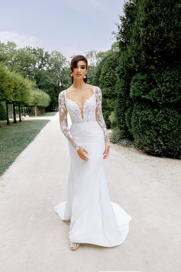 Glamour trifft Raffinesse – Dein eleganter Fit and Flare Traum Du suchst ein Fit and Flare Brautkleid, das nicht nur Deine Figur perfekt in Szene setzt, sondern auch mit femininer Eleganz und einem Hauch Glamour begeistert? Dann wirst Du dieses Modell lieben! Das figurbetonte Design mit leicht ausgestelltem Rock zaubert eine traumhafte Silhouette – ideal für alle, die es elegant, aber nicht überladen mögen. Die zarte florale Spitze im Oberteil sorgt für einen romantischen Look und zieht sich kunstvoll über die langen, transparenten Ärmel bis hin zum tiefen Rücken. Der tiefe Ausschnitt verleiht dem Kleid das gewisse Etwas, bleibt dabei aber stilvoll und edel. Der Rock aus glattem Crêpe bringt Ruhe ins Design und bildet einen modernen Kontrast zur detailreichen Spitze. Die Schleppe rundet den glamourösen Auftritt ab – perfekt für Deinen großen Moment am Altar. Dieses Brautkleid mit langen Ärmeln ist ideal für Herbst- und Winterhochzeiten, aber auch für Bräute, die sich ein elegantes Brautkleid mit Wow-Faktor wünschen. Jetzt entdecken in Deinem Store für Brautmode Köln!