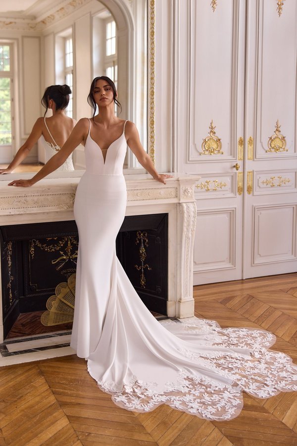 Minimalismus trifft auf pure Eleganz: Dieses Fit and Flare-Brautkleid ist wie gemacht für Bräute, die einen modernen, cleanen Look lieben.  Der glatte Crepe-Stoff schmiegt sich perfekt an Deine Figur an und betont Deine Silhouette auf elegante Weise. Der tiefe V-Ausschnitt und die feinen dünnen Träger verleihen dem Brautkleid Leichtigkeit und lassen Dich strahlen, ohne zu viel zu verraten. Das absolute Highlight ist die Schleppe des Fit and Flare Brautkleides: Sie vereint klare Linien mit romantischer floraler Spitze, die kunstvoll in den Stoff eingearbeitet ist und Deinem Look einen edlen Twist verleiht. Von vorne schlicht, von hinten ein echter Wow-Moment – dieses Hochzeitskleid ist die perfekte Kombination aus clean und elegant. Ob standesamtlich, in einer modernen Location oder als Abendkleid bei der Feier – dieses Modell passt sich Deinem Stil an.  Entdecke Dein Traumkleid in unserem Store und finde Dein persönliches Fashion-Statement bei Cinderella Brautmode Köln.