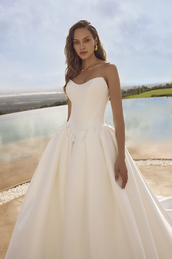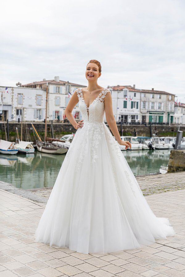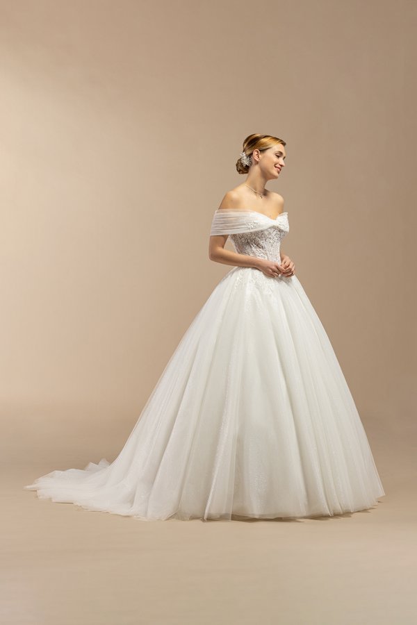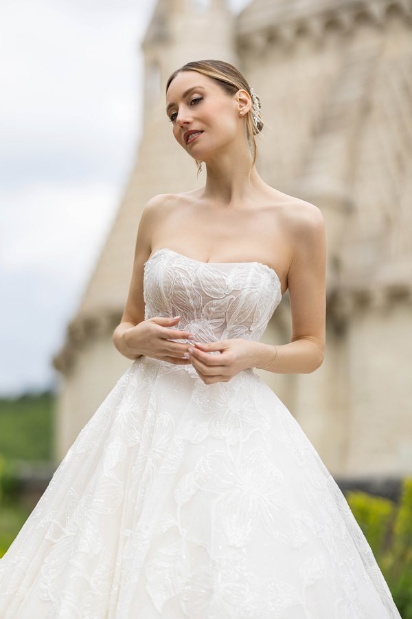 Dieses extravagante Prinzessinnen Brautkleid ist ein absolutes Highlight für Bräute, die auf der Suche nach einem glamourösen Auftritt sind. Das Korsagen-Oberteil in schimmernder Glitzer- und Perlenoptik setzt Deine Figur elegant in Szene und verleiht Dir einen einzigartigen Look. Die tiefe Basken-Taille verlängert optisch Deinen Oberkörper und geht in einen üppigen, voluminösen Rock über, der aus luxuriösem Mikado gefertigt ist und majestätisch fällt. Besonders aufregend: die abnehmbaren Ärmel mit glitzernden Perlen, die Dir die Möglichkeit geben, Deinen Look zwischen Zeremonie und Feier zu variieren. Ob romantische Trauung oder glamouröse Abendparty – dieses Kleid vereint zeitlose Eleganz mit einem Hauch Extravaganz. Wenn Du Dir schon immer den ganz großen Auftritt gewünscht hast, wirst Du Dich in diesem Kleid absolut königlich fühlen. Entdecke dieses extravagante Prinzessinnen Brautkleid bei Cinderella– Deinem Brautmodengeschäft für Brautmode Köln – und lass Dich verzaubern.