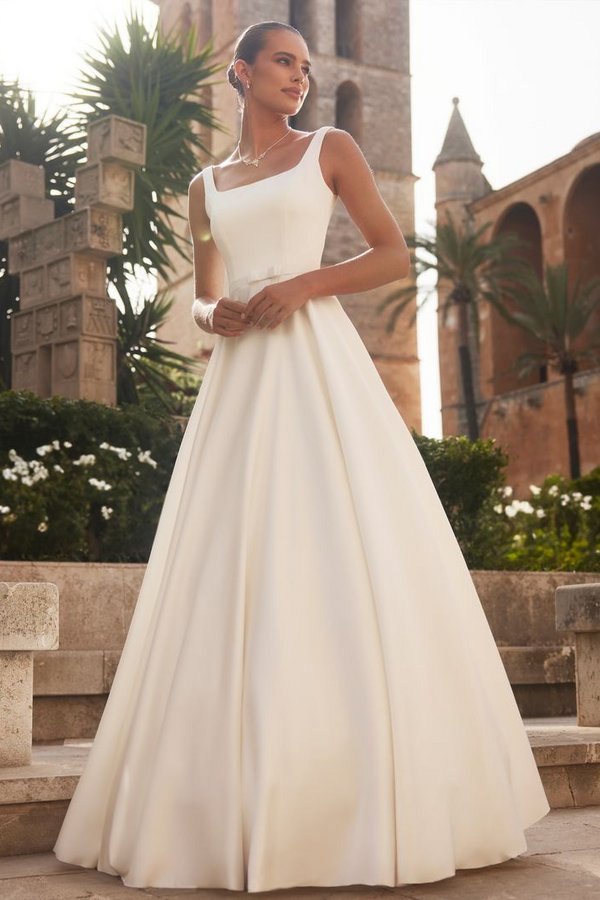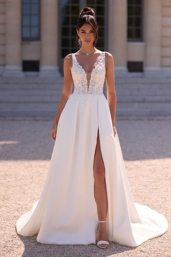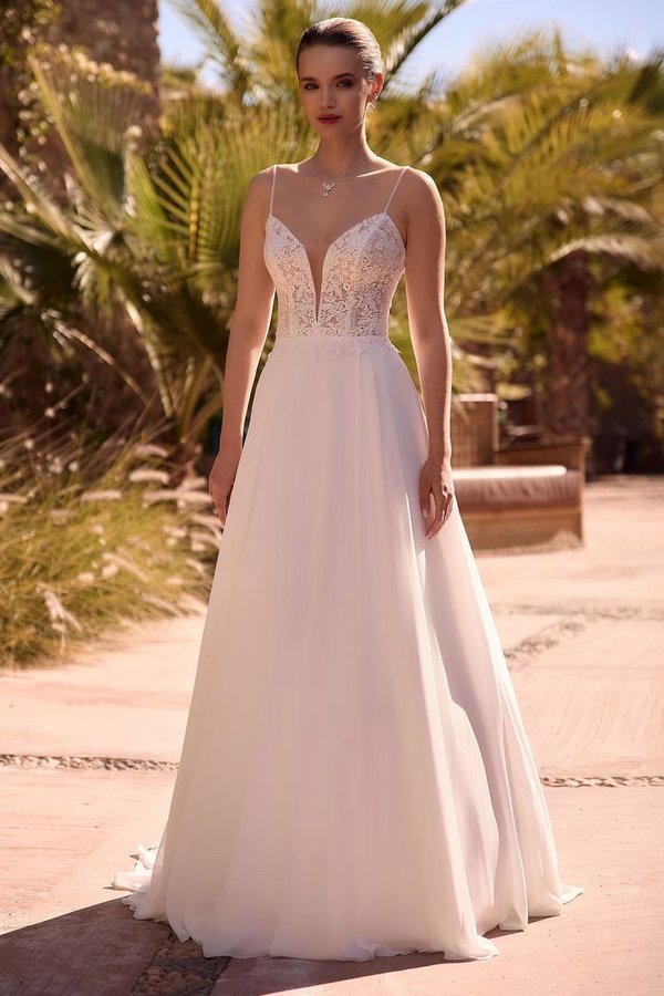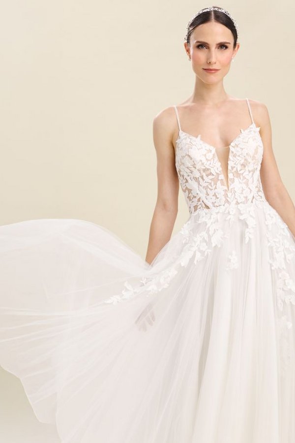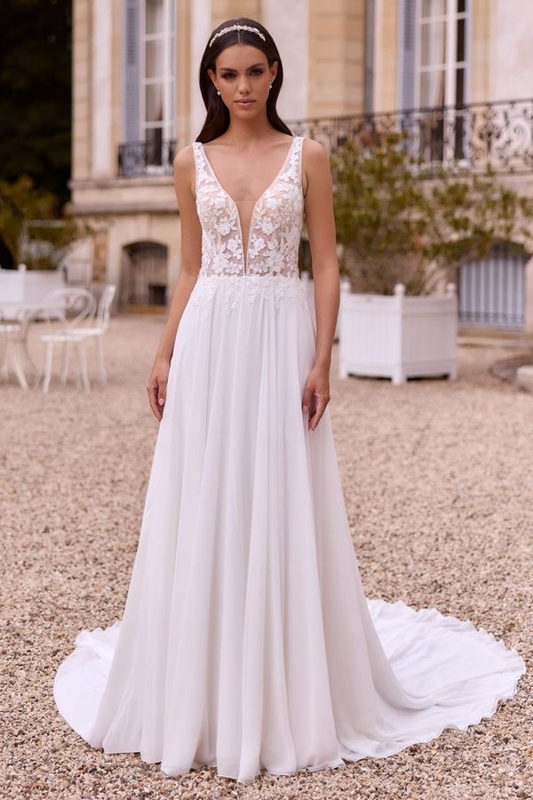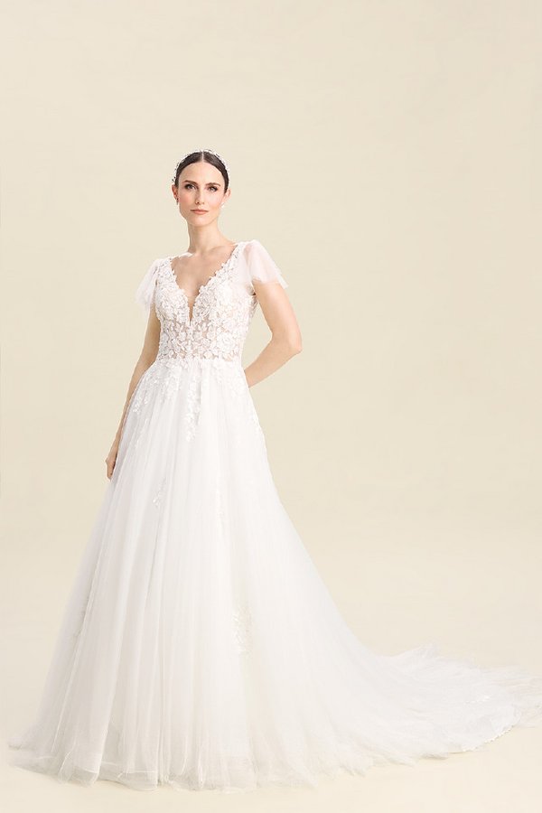Prinzessinnen-Brautkleid mit Blumenspitze und Glitzer Dieses Prinzessinnen-Brautkleid kombiniert moderne Eleganz mit einem Hauch Glamour. Das trägerlose, transparente Mieder ist mit feiner Blumenspitze verziert, die sich sanft über den glitzernden Tüllrock zieht. Der Schnitt schmeichelt deiner Figur, betont die Taille und sorgt für eine fließende, leichte Silhouette. Der Rock aus mehrlagigem Softtüll bringt Bewegung in deinen Look, während das dezente Funkeln für den perfekten Auftritt sorgt – ob im Standesamt, in der Kirche oder unter freiem Himmel. Das transparente Oberteil mit romantischer Spitzenapplikation verleiht dem Kleid eine edle Tiefe, ohne überladen zu wirken. Wenn du ein romantisches Brautkleid suchst, das feminin und modern zugleich ist, wirst du dich in dieses Modell verlieben. Ideal für Bräute, die das gewisse Etwas wollen – und dabei Wert auf eine bequeme Passform legen. Entdecke dieses Brautkleid mit Glitzer und Blumenspitze jetzt in der Brautmode Köln und lass dich persönlich beraten.