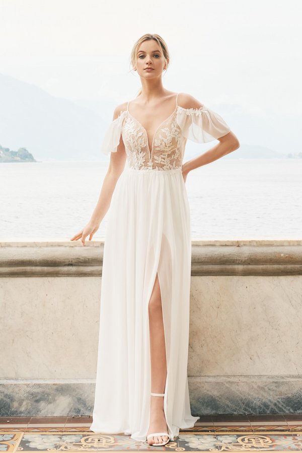 Dieses zauberhafte Brautkleid aus Chiffon und Spitze ist ein Traum für alle Romantikerinnen. Die Flügelärmel verleihen dem Kleid einen verspielten Touch und sind ein echtes Highlight. Die Liebe zum Detail zeigt sich in den Spitzendetails am oberen Rand der Ärmel, die das Gesamtbild des Kleides noch verzaubernder machen. Auf dem Oberteil ist leichte Blätterspitze zu finden, die den Ausschnitt und den Rücken schmückt. Ein feines Perlenband umrahmt das Oberteil bis in die Träger, was dem Kleid eine zarte Eleganz verleiht. Der leichte Chiffon-Rock ist am Taillenbund gerafft, wodurch er extra fließend und natürlich fällt. Ein Beinschlitz vervollständigt den romantischen Look und gibt dem Kleid eine verführerische Note. Ein wahrer Traum für romantische Bräute, die sich in diesem Brautkleid wie eine Märchenprinzessin fühlen werden.