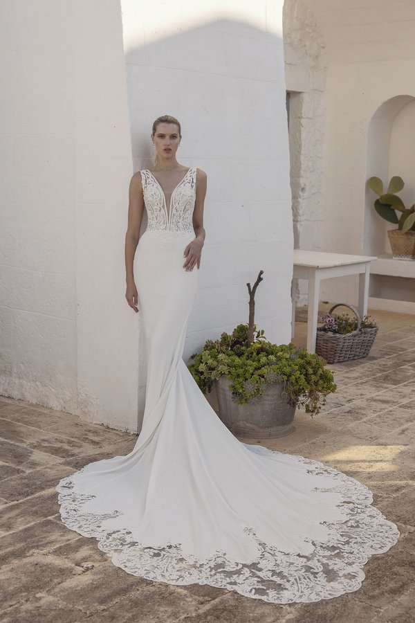 In diesem schlichten, aber dennoch eleganten Brautkleid erlebst du zeitlose Schönheit und pure Eleganz. Die A-Linie des Kleides wird durch einen V-Ausschnitt sowohl vorne als auch hinten betont, während breite Träger für einen angenehmen Tragekomfort sorgen. Der traumhafte Chiffon-Rock, der in einer kappellenlangen Schleppe ausläuft, verleiht dem Kleid eine leichte und luftige Note. Ein wahrer Hingucker sind die kunstvollen Spitzendetails, die die transparente Taille des Kleides zieren. Hier sorgt das subtile Durchschimmern deiner Haut für eine reizvolle Unterbrechung und schafft eine wunderschöne Silhouette. Dieses Kleid ist der ideale Begleiter für die Braut, die zeitlose Eleganz und schlichte Raffinesse zu schätzen weiß. Ein echter Favorit unter unseren Klassikern, der deinen Hochzeitstag mit zeitloser Schönheit erstrahlen lässt.