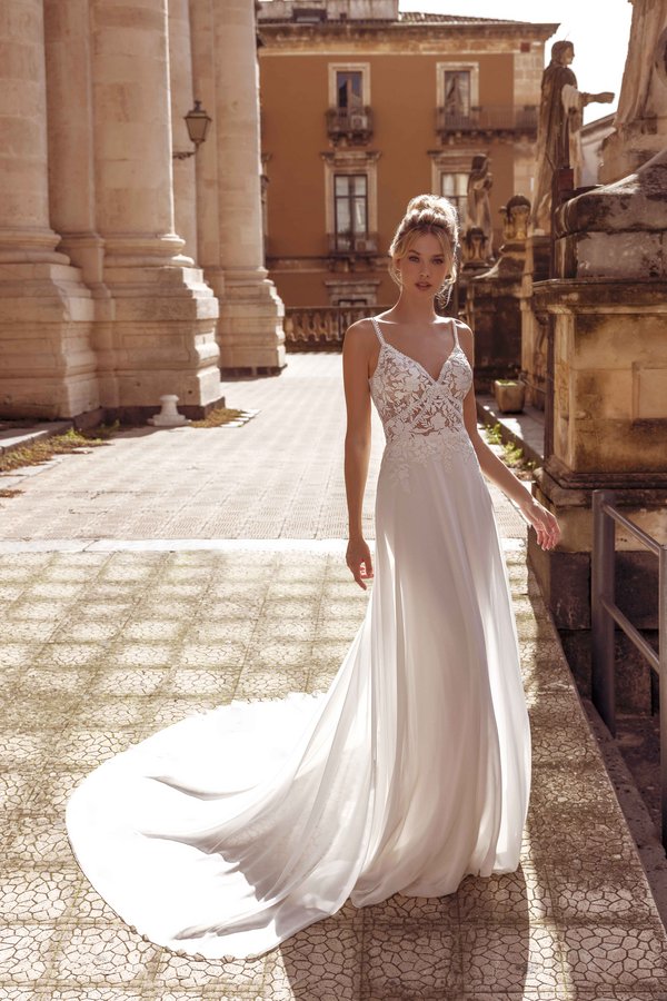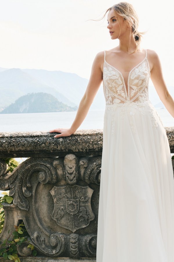 In diesem A-Linien Brautkleid aus Chiffon werden Sie sich unglaublich wohl fühlen. Das transparente Spitzenmieder hat einen klassischen V-Ausschnitt und zarte dünne Träger. Der offene Rücken macht dieses Kleid sowohl feminin als auch sexy. Der fließende Chiffonrock erzeugt eine weiche Bewegung, perfekt für die Braut, die ein Hochzeitskleid mit einer leichten und einfachen Form anstrebt.